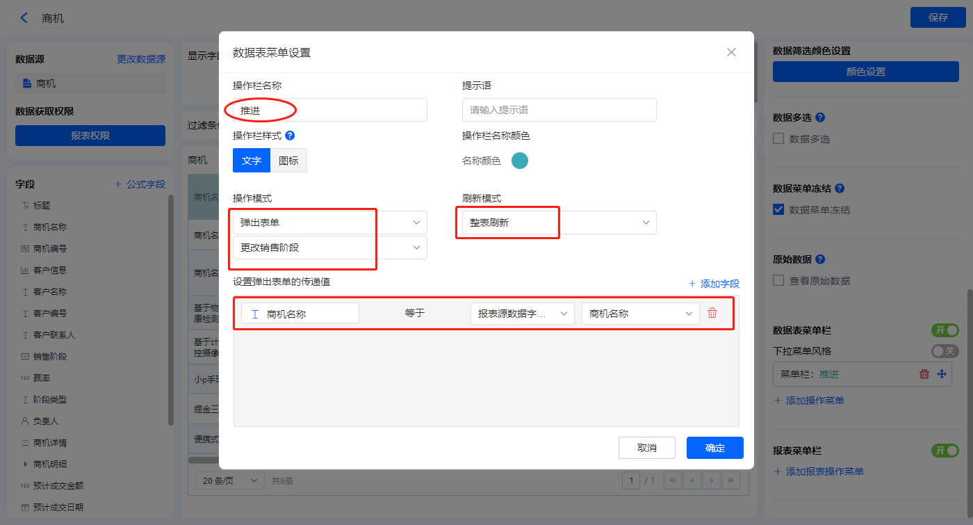 【推进】的菜单栏,操作模式设置为弹出辅助表单【更改销售阶段】,并设置刷新模式为整表刷新,设置表单传递值,点击【确认】;;