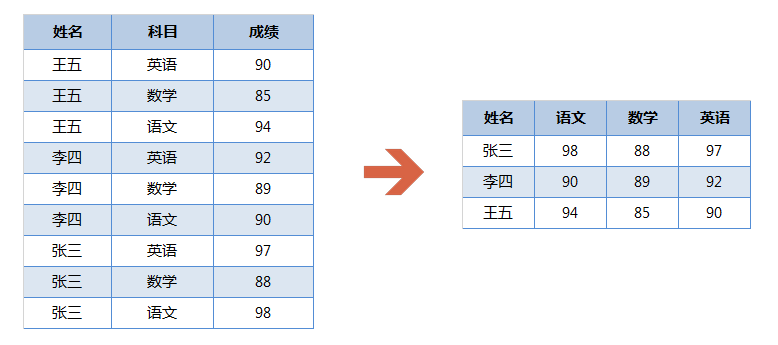 行转列可将一维表转成二维表: