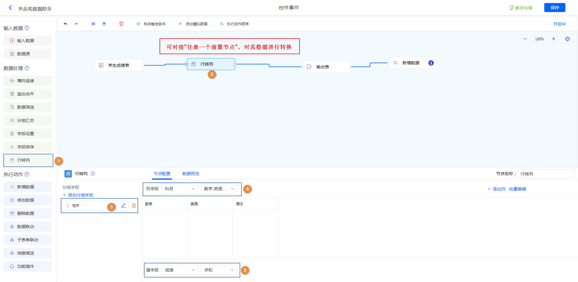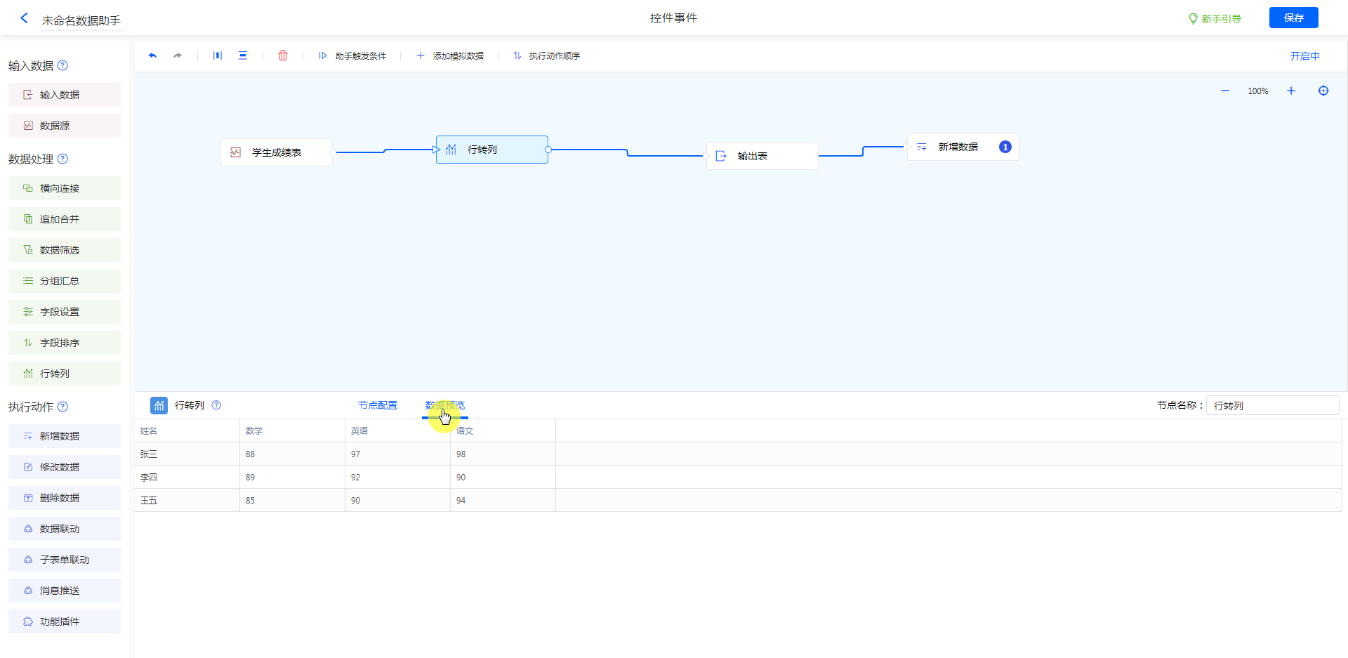 节点配置好后,点击 [数据预览] 可以查看行转列后的数据效果。