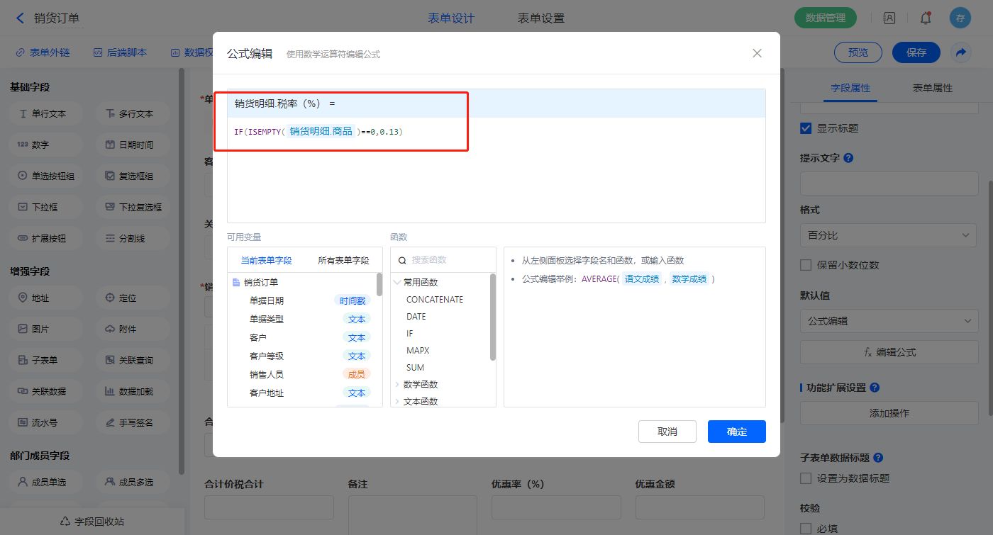 【收款金额】字段默认值设置为公式编辑,如图设置公式;