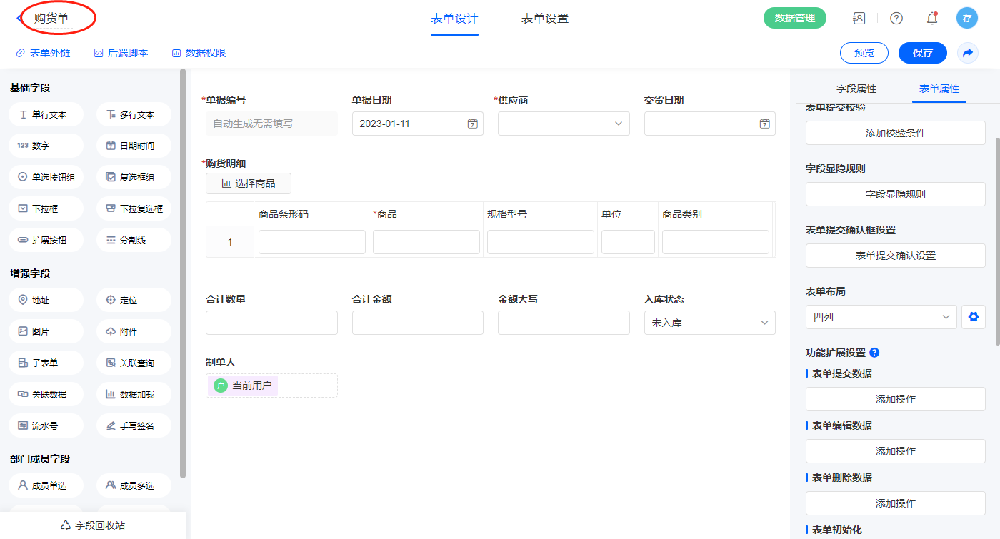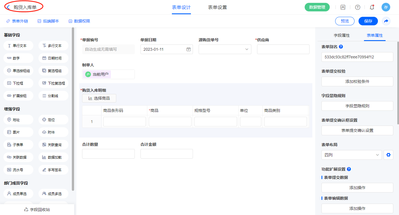 - 2.4、表单【购货入库单】字段及表单属性设置