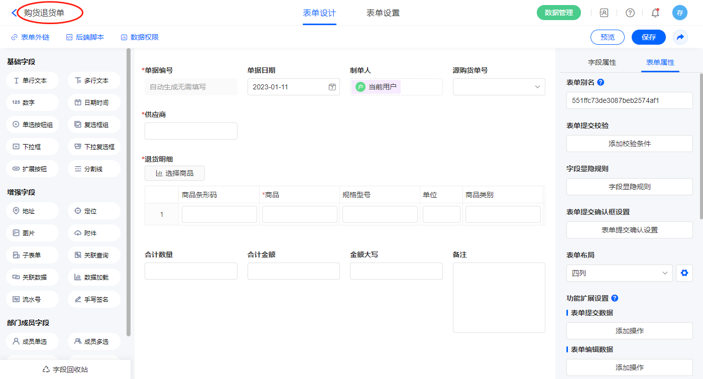 - 2.3、表单【购货退货单】字段及表单属性设置