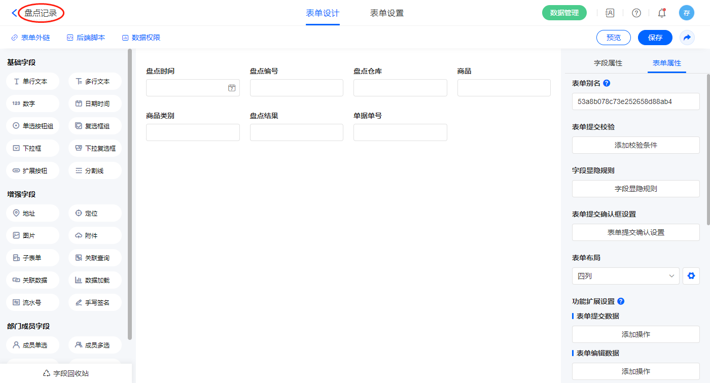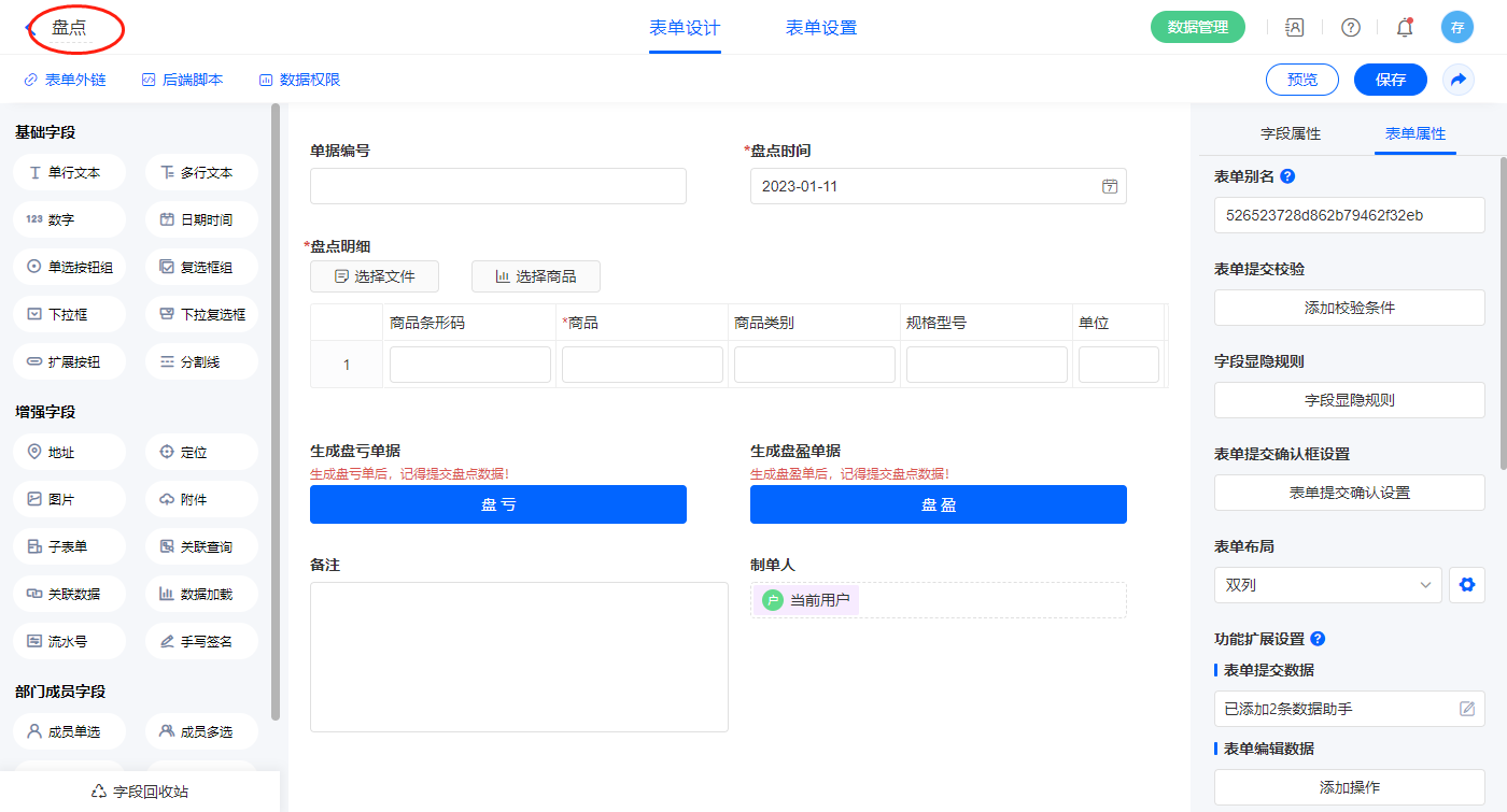 1)新增【盘点记录】报表,用基础报表【数据表】展示数据源为表单【盘点记录】的数据;