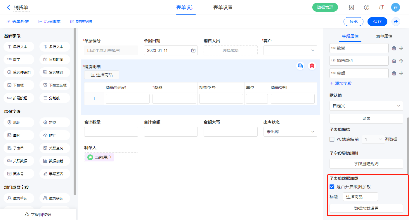 1)选中【调拨明细】字段,开启子表单数据加载;