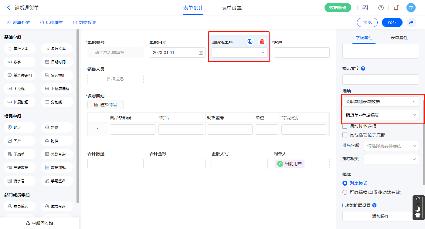 1)【源销货退货单】字段,选择设置为关联其他表单数据,关联销货退货单的【单据编号】字段;