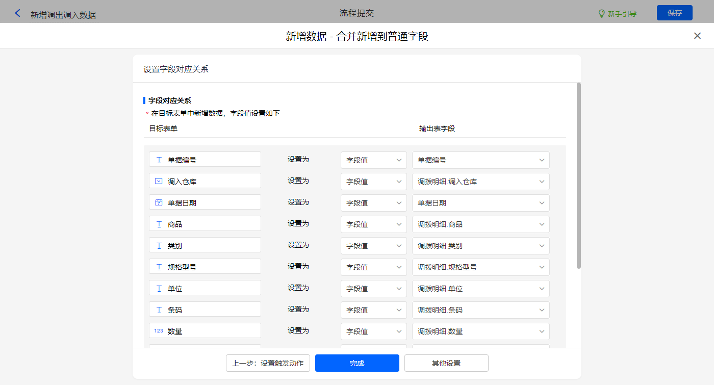 添加新增数据的执行动作,选择目标表单【调拨单_调入】,选择对应字段,设置好点击【完成】并保存该数据助手;