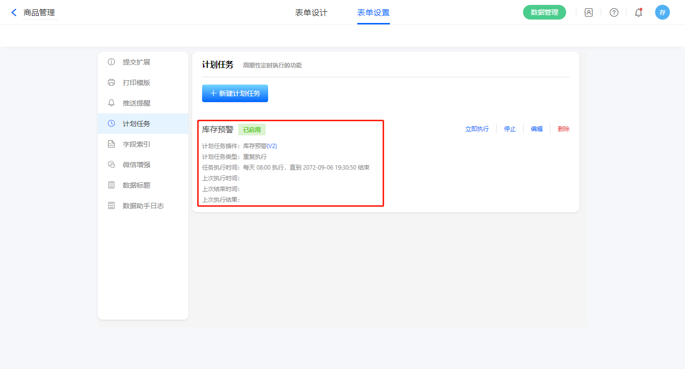 【库存预警】插件的设置如图所示,该插件设置涉及代码可进入应用详情查看;