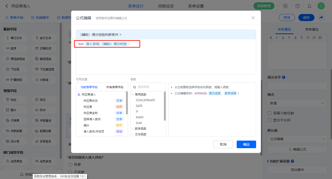 【(辅助)得分检验判断条件】字段,设置默认值为公式编辑,如图设置公式;