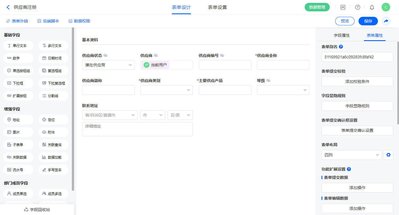 2.2、表单【供应商注册】字段及表单属性设置