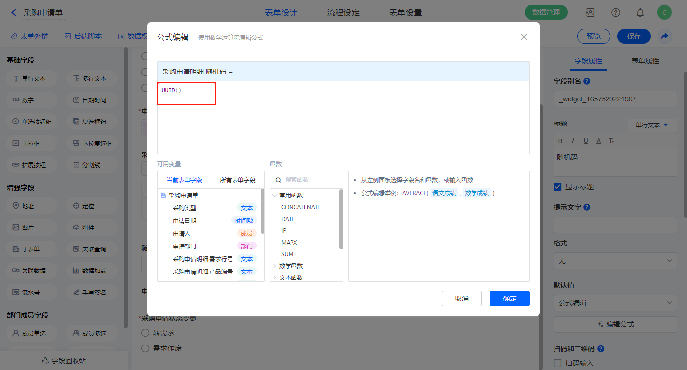 【采购申请明细.随机码】字段,设置默认值为公式编辑,如图设置公式;