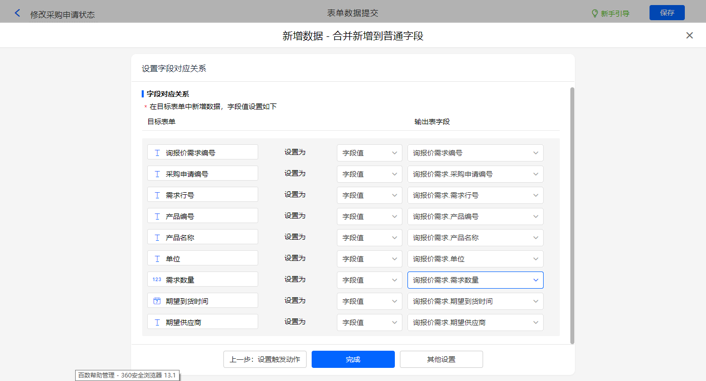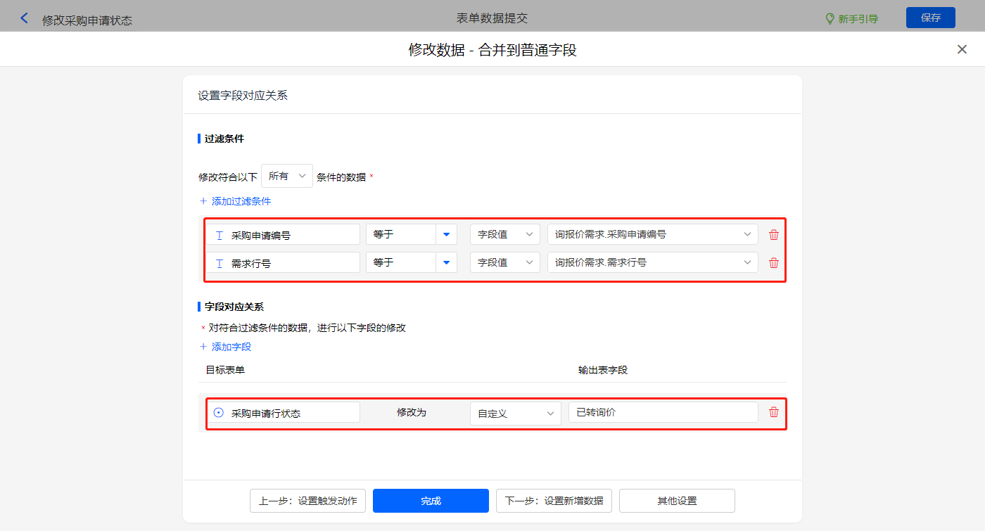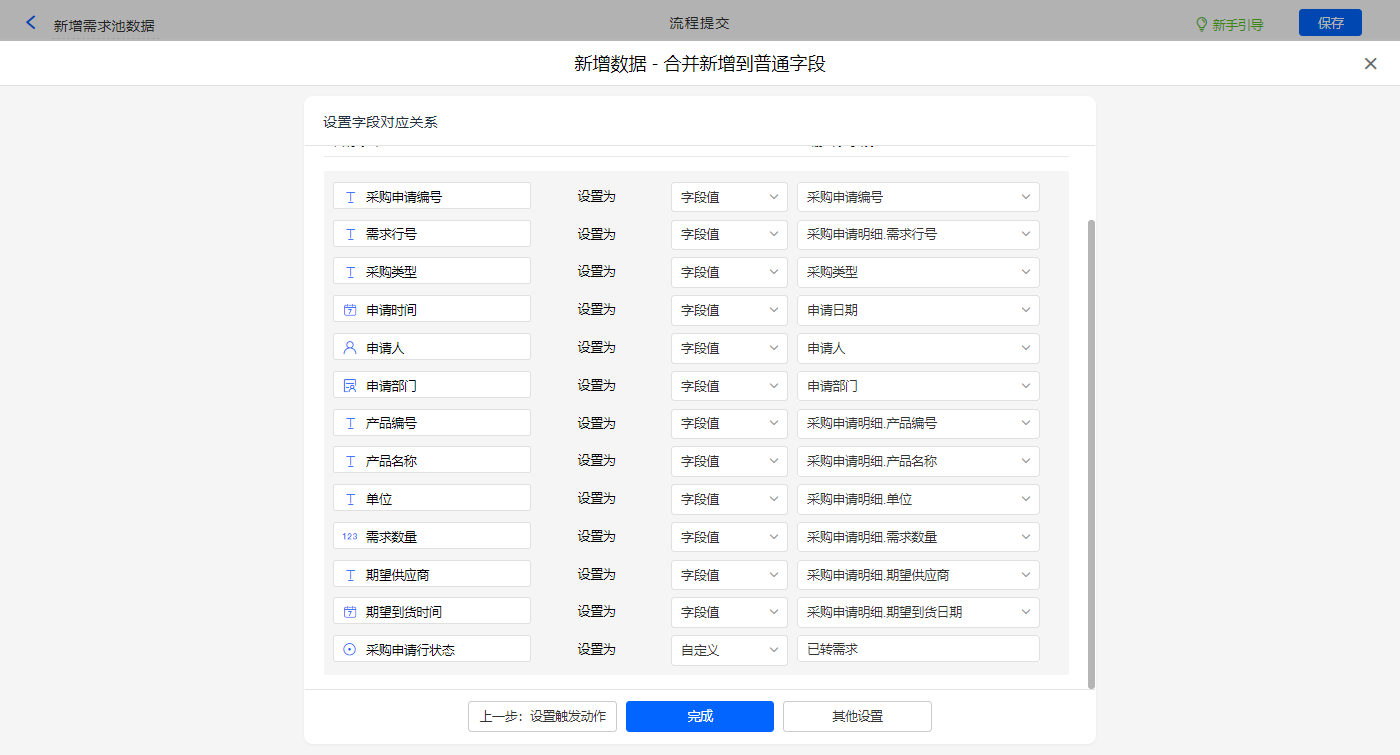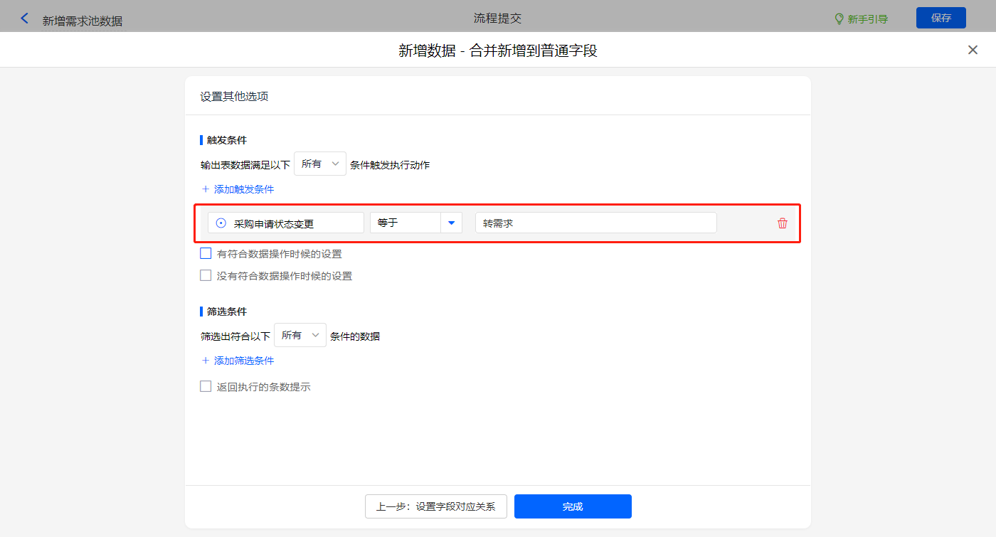 其他设置触发条件为【采购申请状态变更】字段等于转需求,设置好点击【完成】并保存该数据助手;