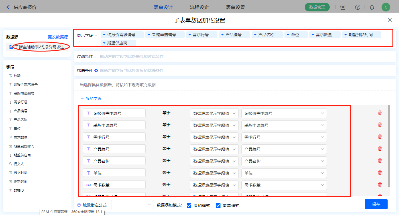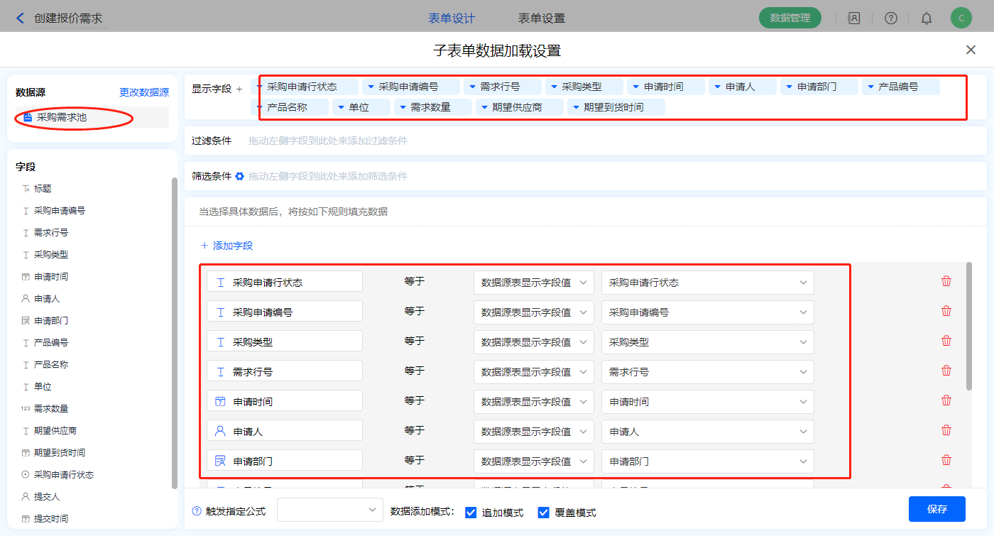 1)【询报价需求】子表单字段,开启数据加载,数据源为【采购需求池】,添加显示字段设置好赋值字段,点击保存;