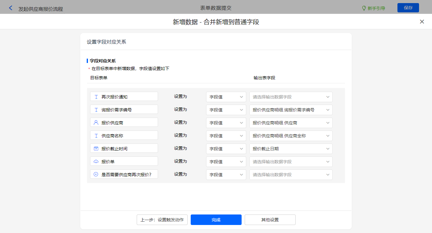 新增新增数据的执行动作,选择目标表单【供应商报价】,设置对应赋值字段,设置好点击【完成】并保存该数据助手;