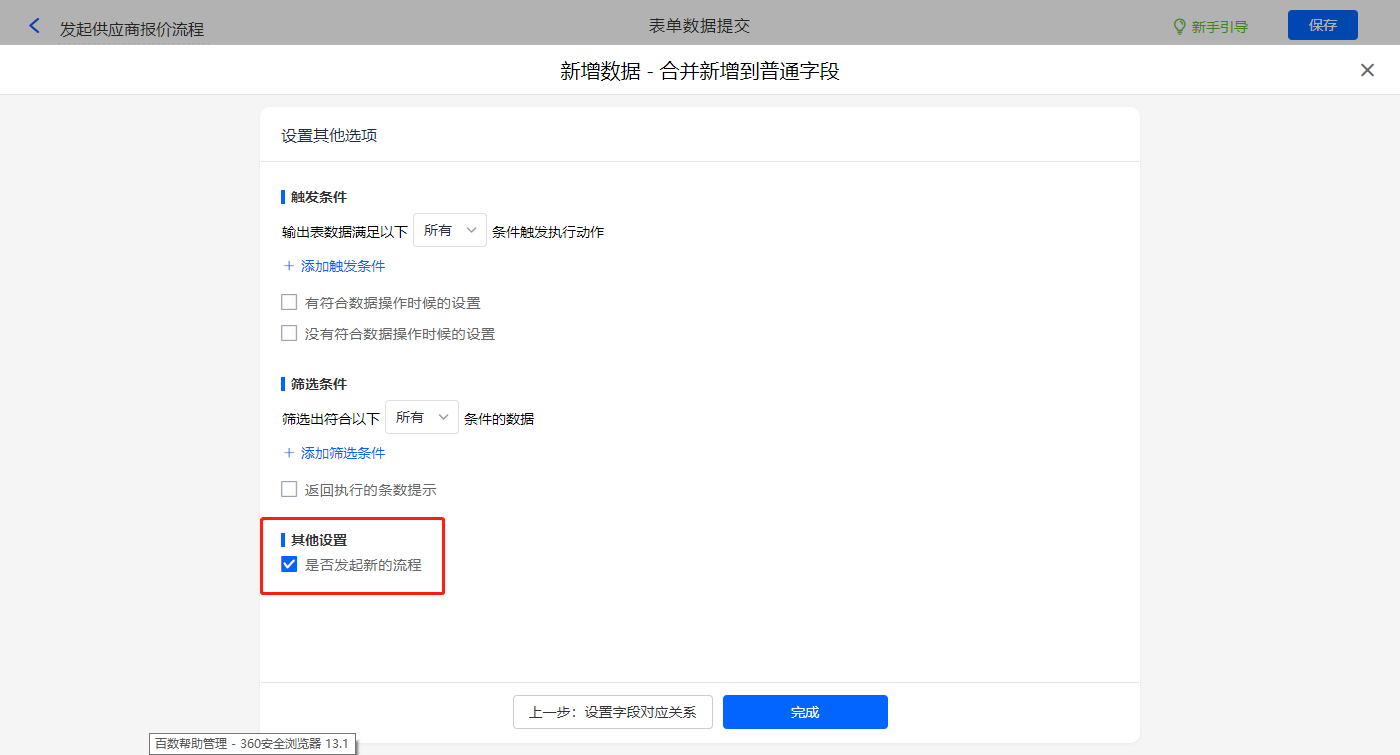 其他设置里勾选是否发起新流程,设置好点击【完成】并保存该数据助手;