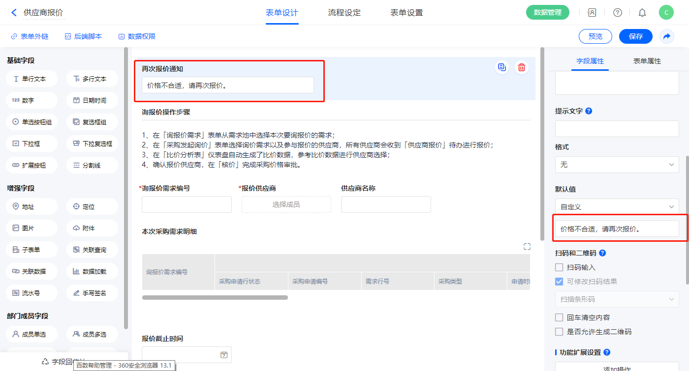 1)【再次报价通知】字段,设置默认值为“价格不合适,请再次报价。”;