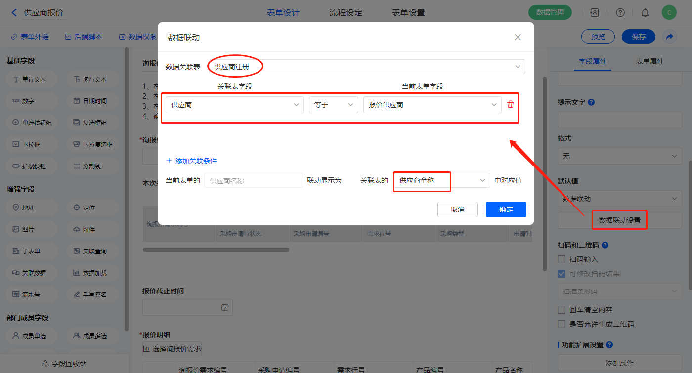 2)【供应商名称】字段设置默认值为数据联动,设置联动条件及联动字段;