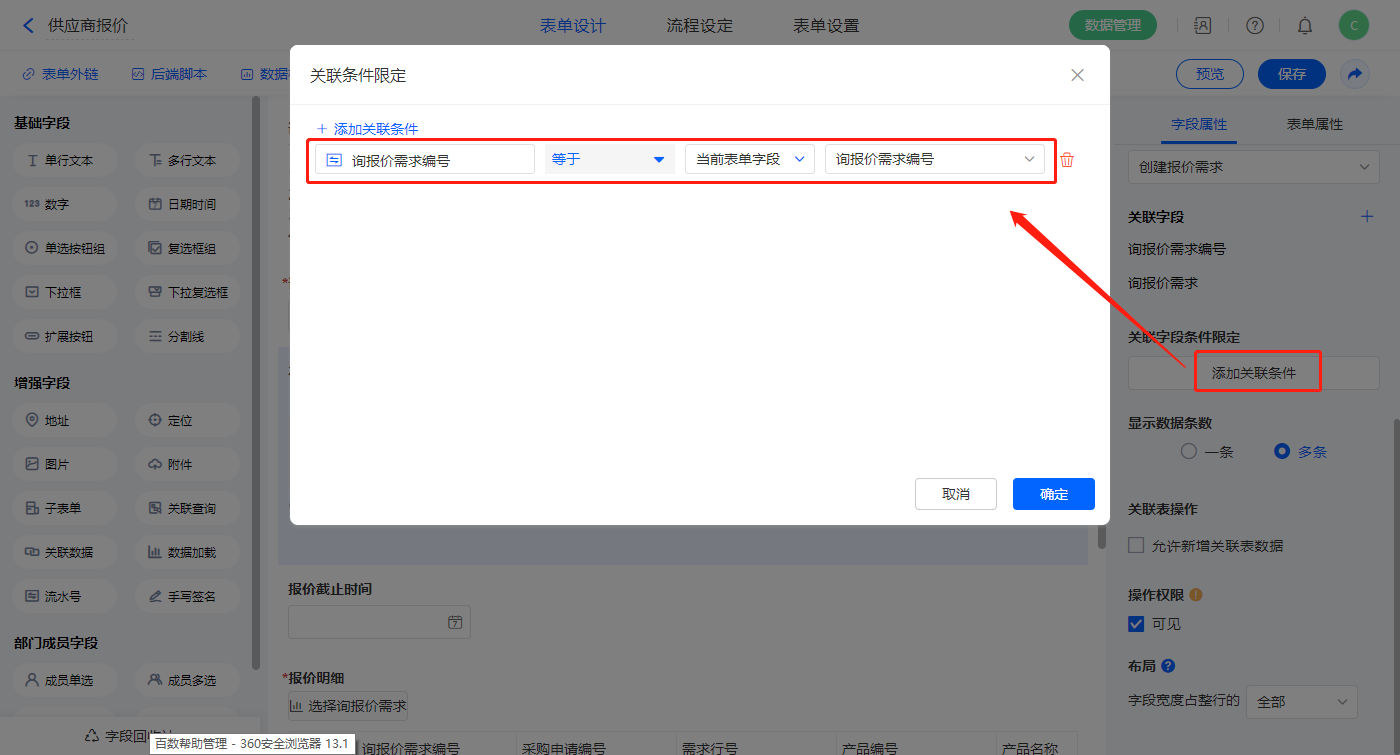 3)【本次采购需求明细】关联查询字段,设置关联表为【供应商注册】并如图选择关联字段,设置显示数据条数为多条;
