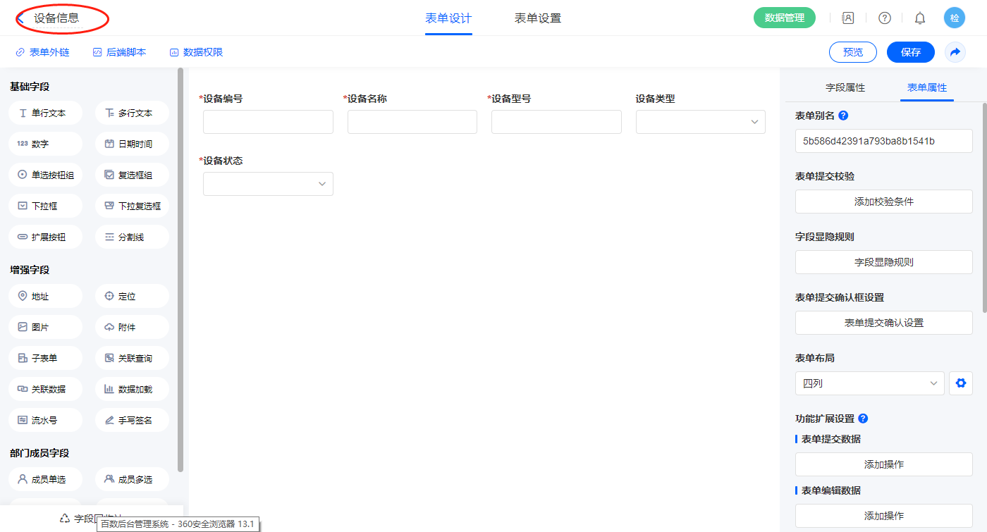 3)【质检方案.使用设备】字段,选择设置为关联其他表单数据,关联设备信息的【设备名称】字段;