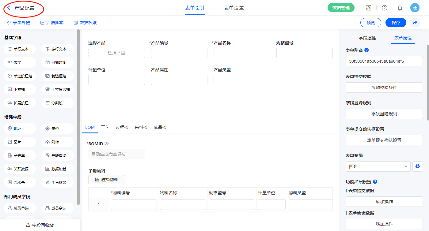 【物料清单】子表单字段,设置默认值为数据联动,关联表及关联条件相同,设置对应的联动字段即可;