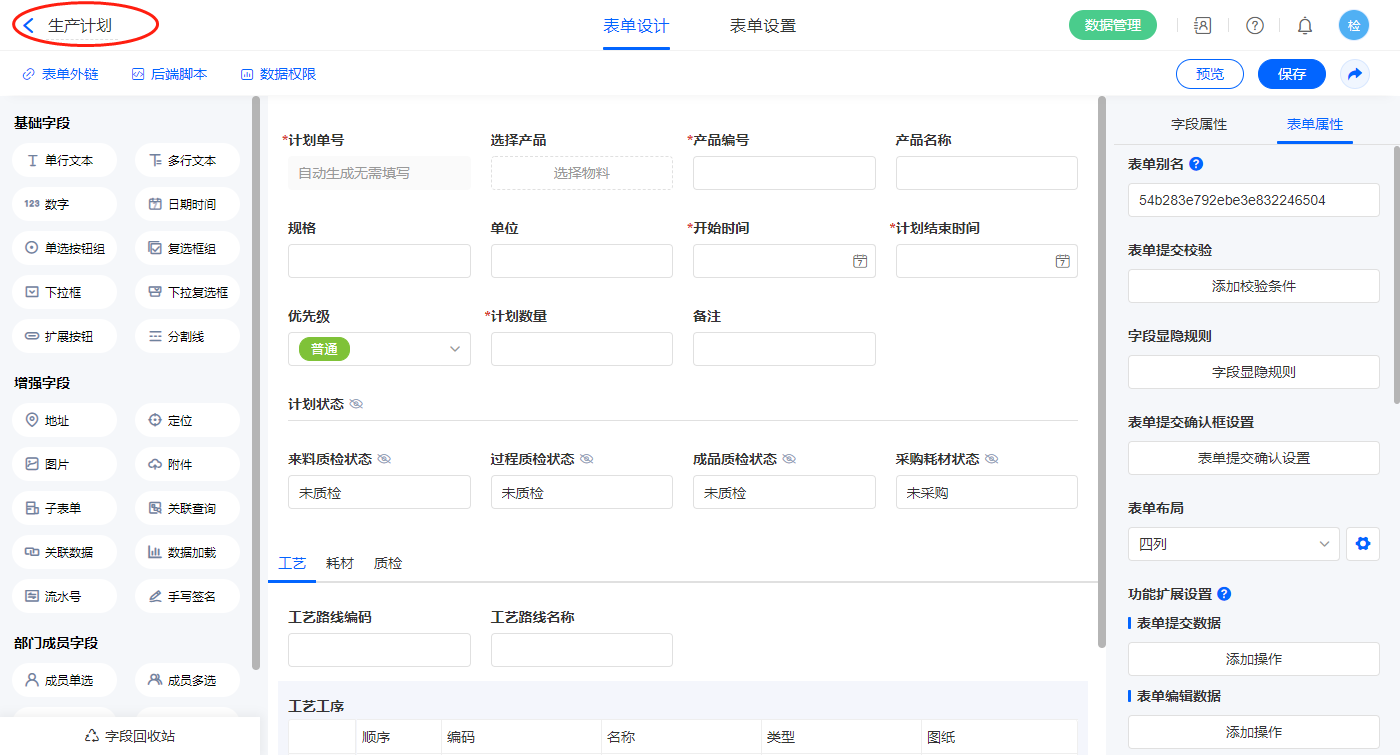 4)【关联计划单号】字段,选择设置为关联其他表单数据,关联生产计划的【计划单号】字段;