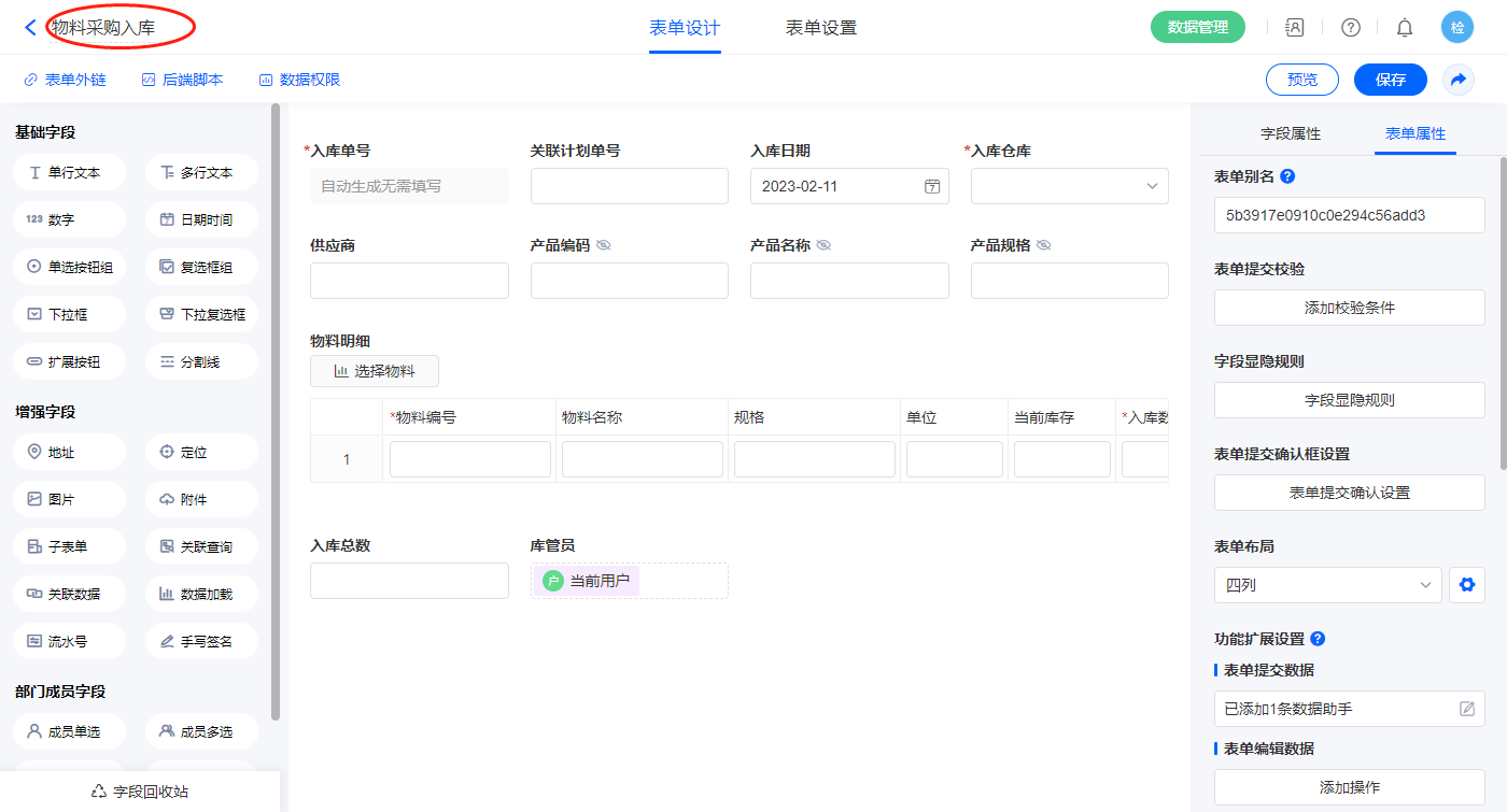 【采购耗材】菜单栏,操作模式设置为弹出表单【材料采购入库】;