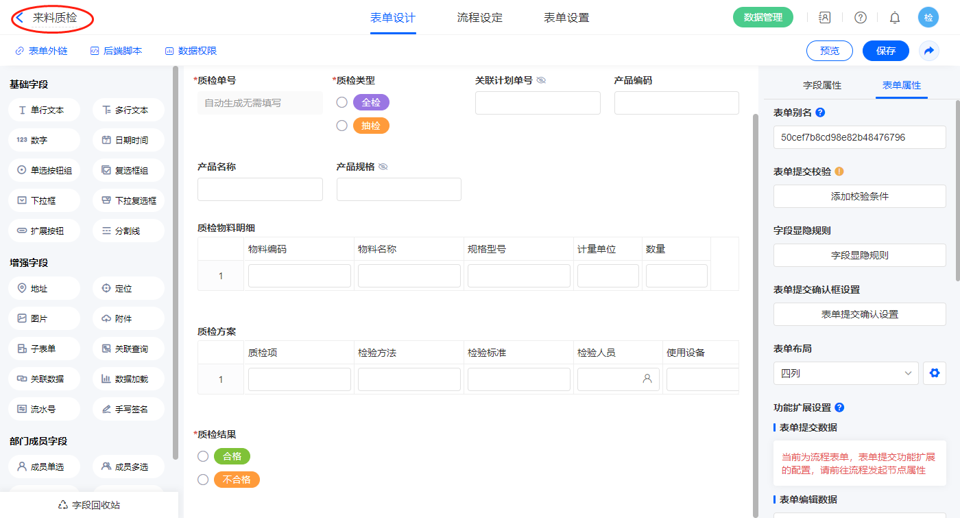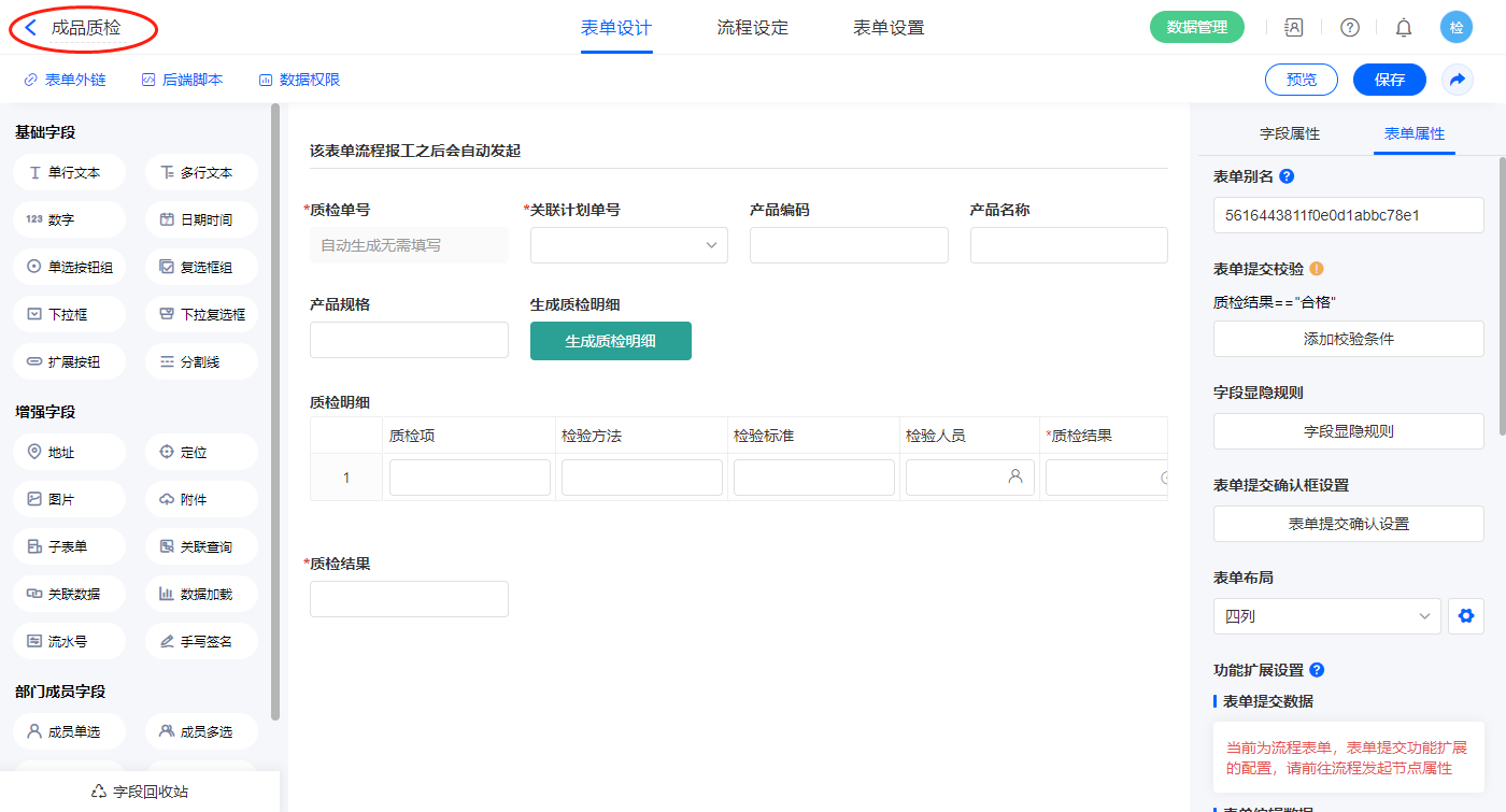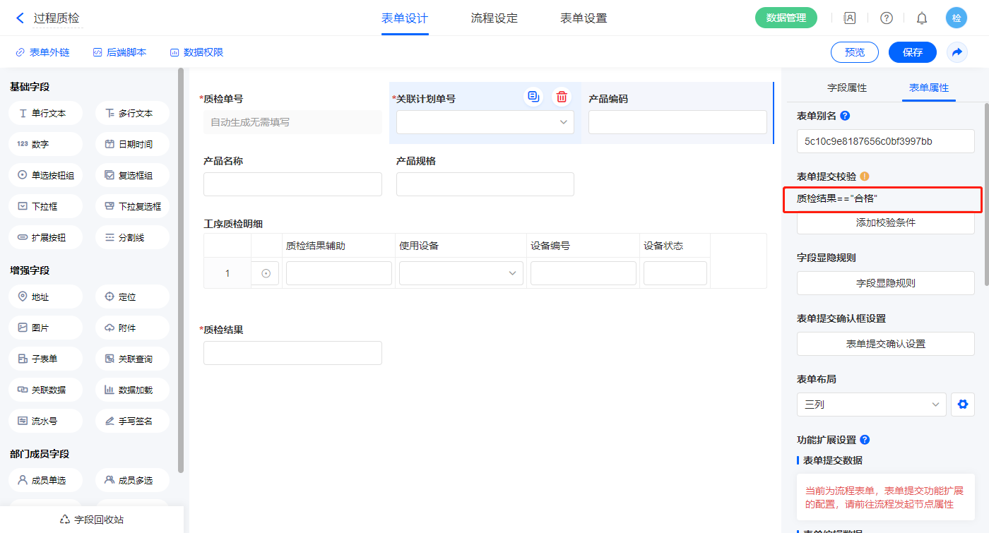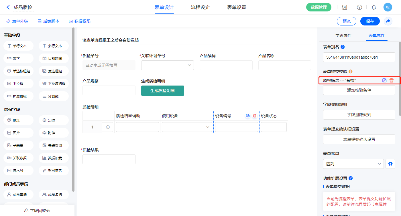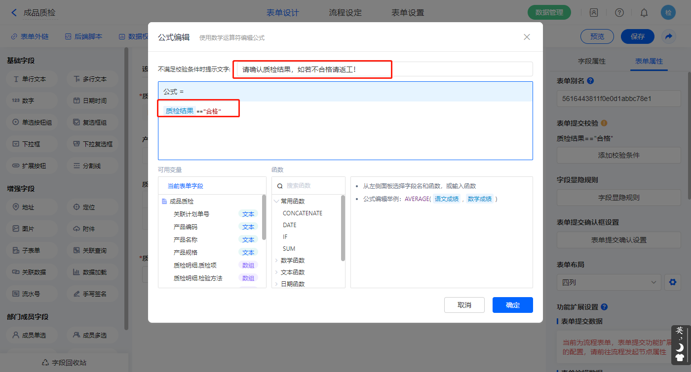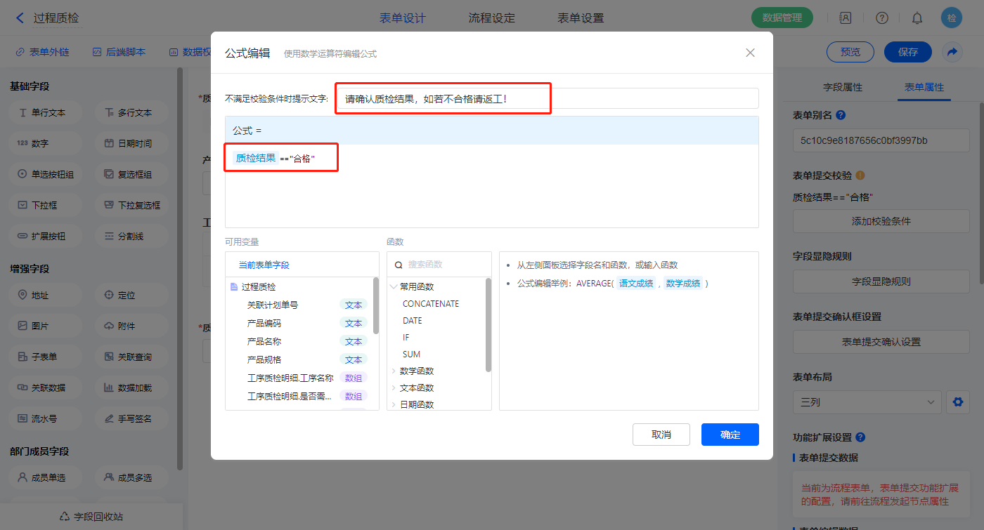 当公式“质检结果=="合格"”不满足提交时报“请确认质检结果,如若不合格请返工!”提示;