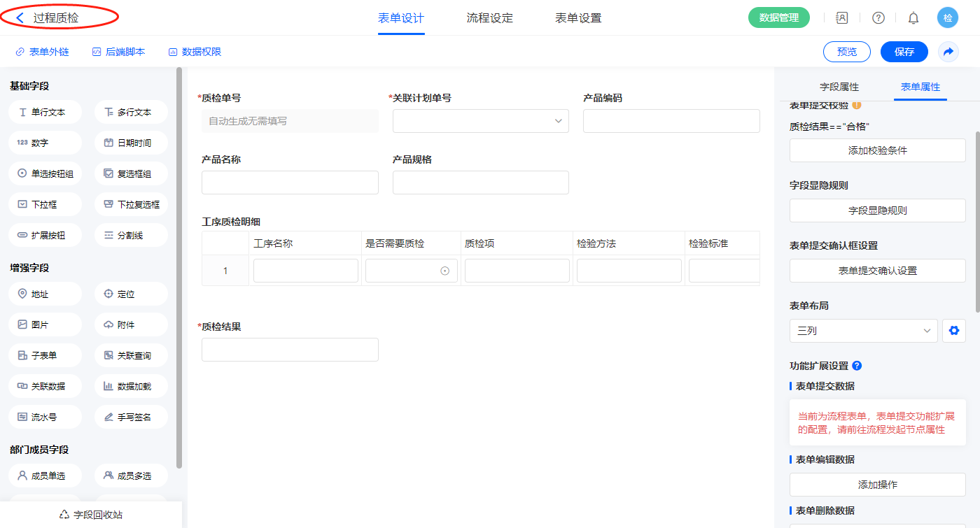 【过程检】菜单栏,操作模式设置为弹出表单【过程质检】;