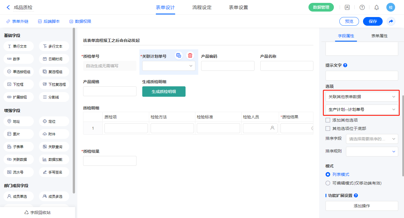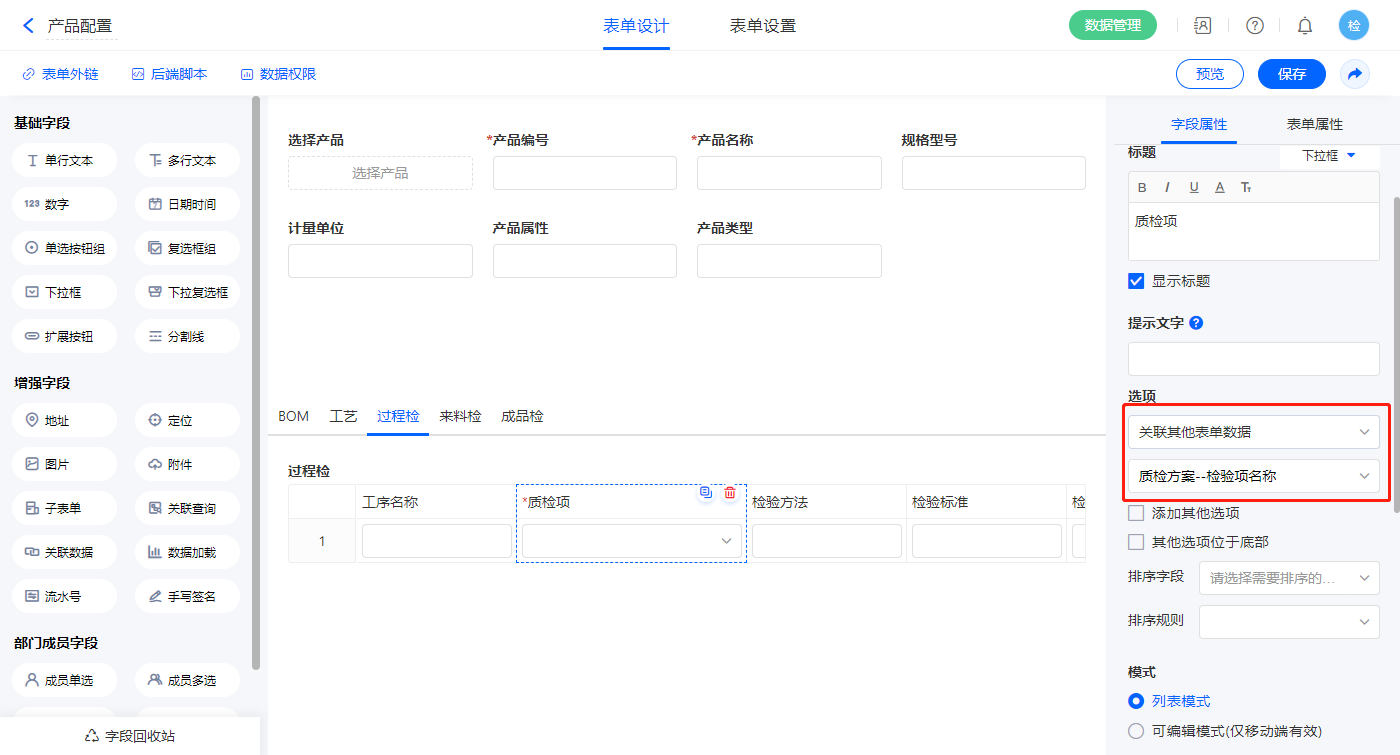 4)【过程检.质检项】、【来料检.质检项】、【成品检.质检项】字段,选择设置为关联其他表单数据,关联质检方案的【检验项名称】字段;