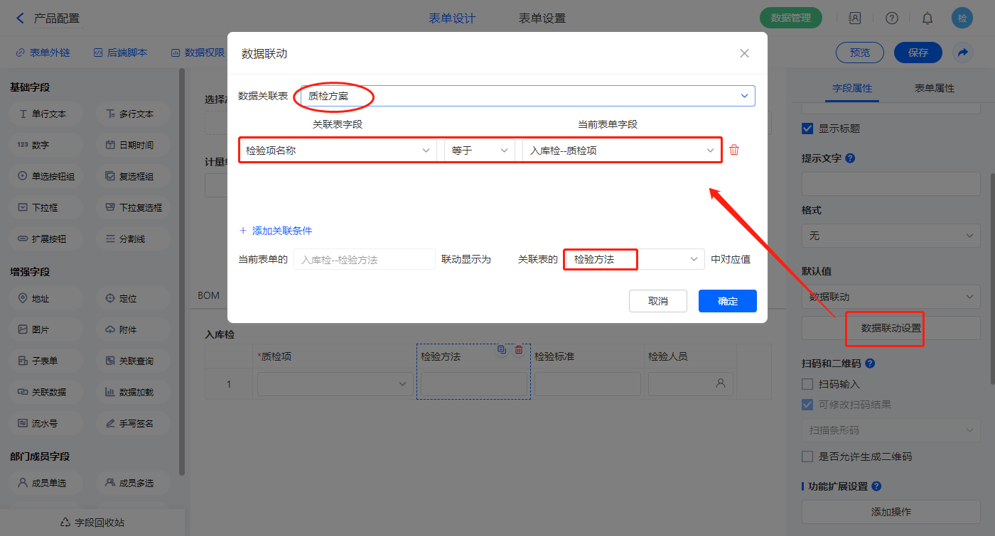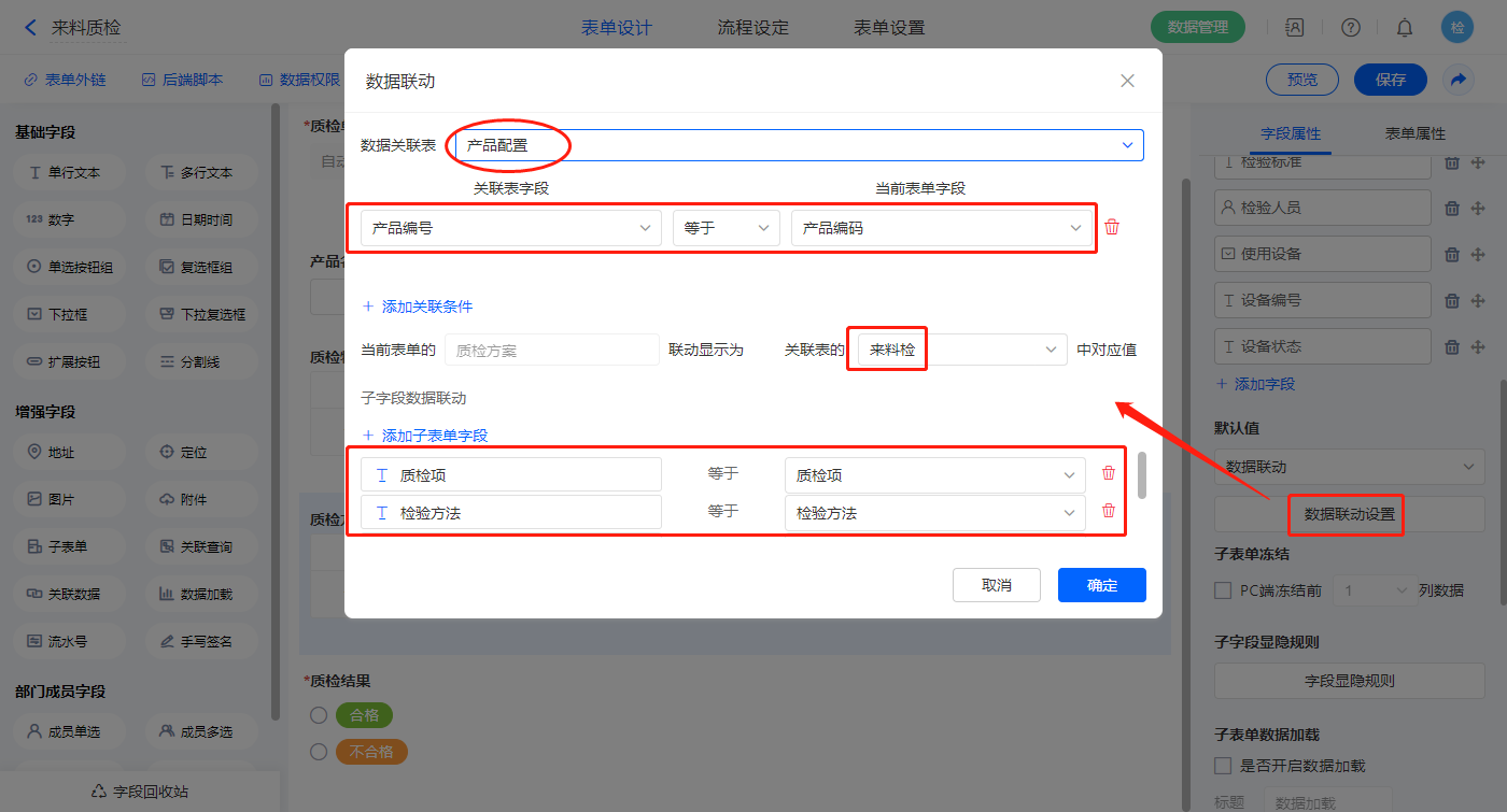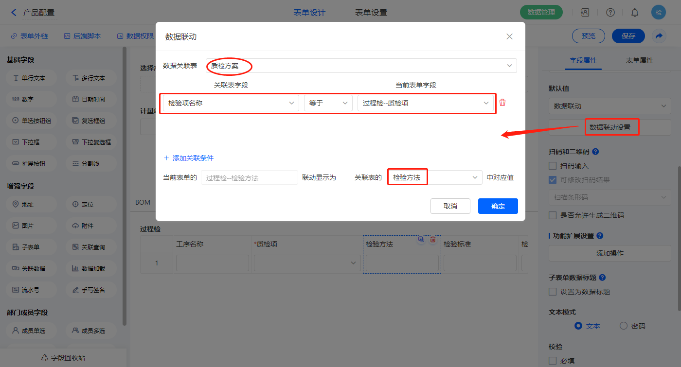 2)【质检方案】子表单字段,设置默认值为数据联动,设置联动条件及联动字段;