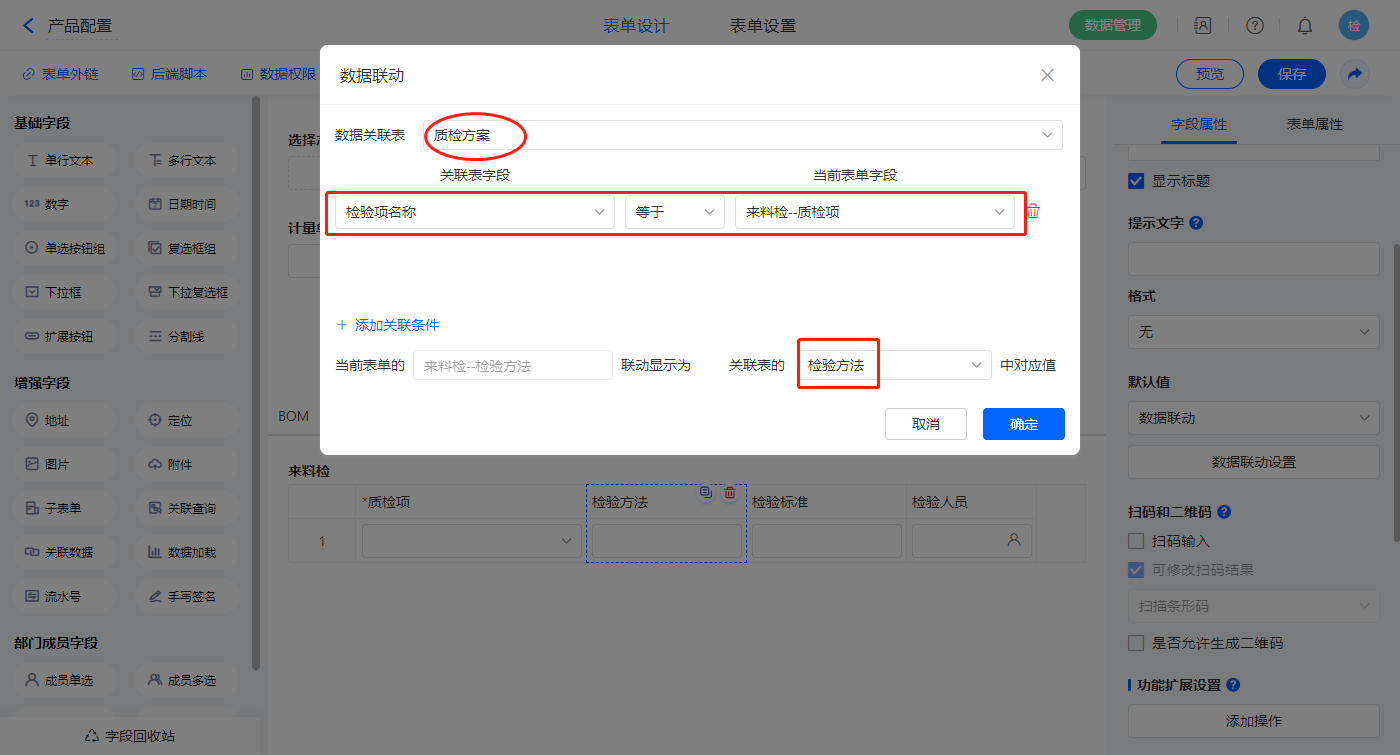 【来料检.检验方法】、【来料检.检验标准】、【来料检.检验人员】字段,设置默认值为数据联动,以上字段关联表及关联条件相同,设置对应的联动字段即可;