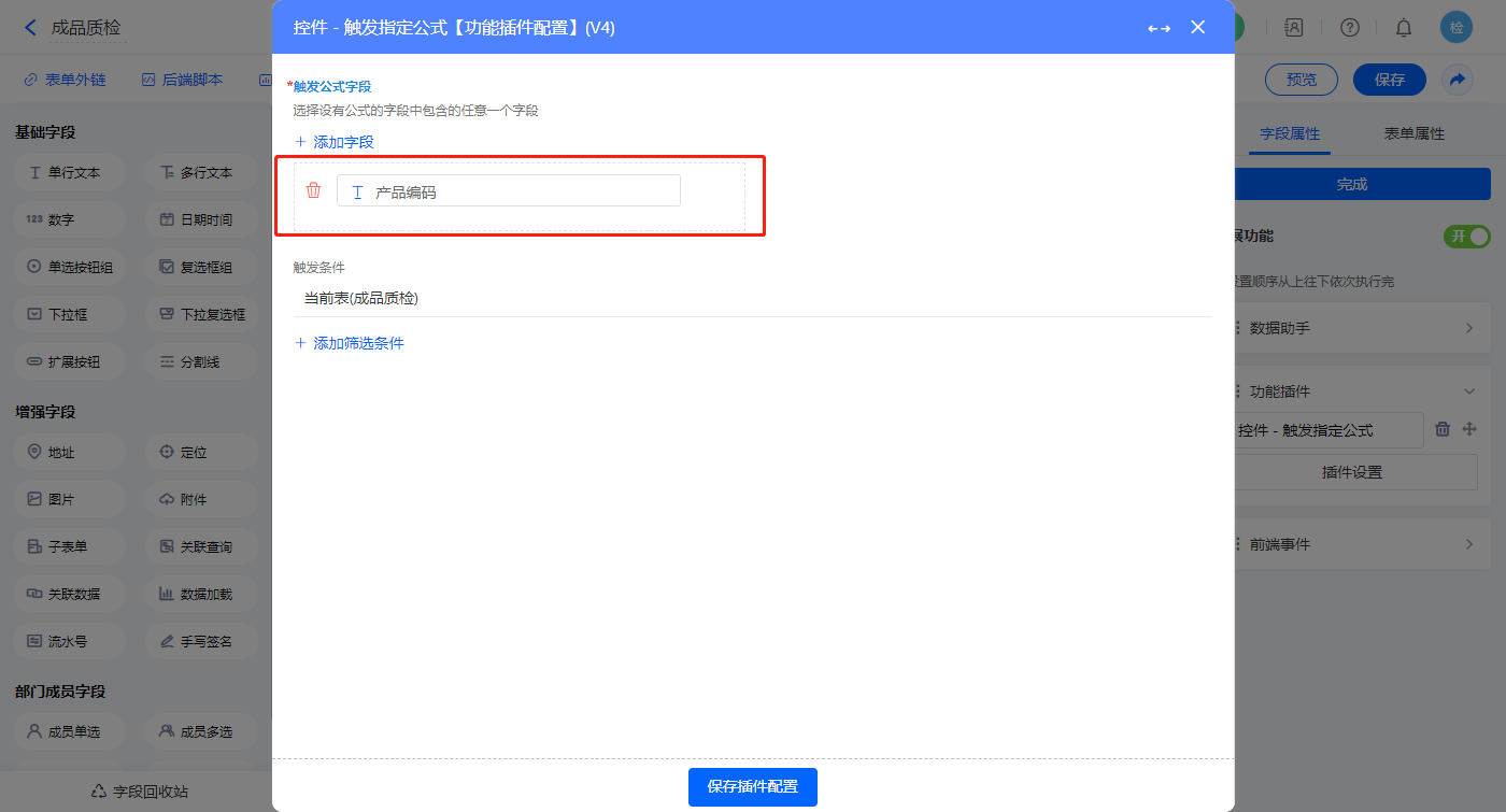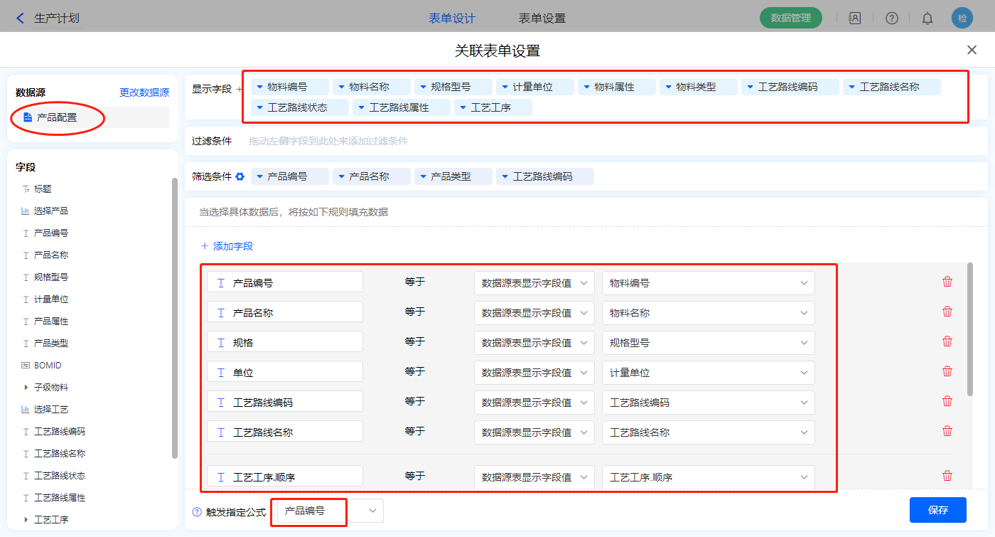 1)【选择产品】数据加载字段,数据源为【产品配置】,添加显示字段设置赋值字段及筛选条件,触发指定公式为【产品编号】字段,点击保存;