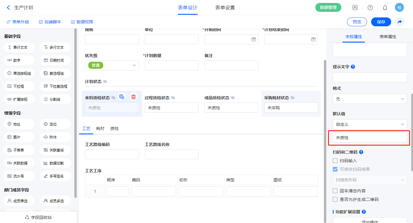 3)【来料质检状态】、【过程质检状态】、【成品质检状态】、【采购耗材状态】分别设置默认值为:“未质检”、“未质检”、“未质检”、“未采购”;