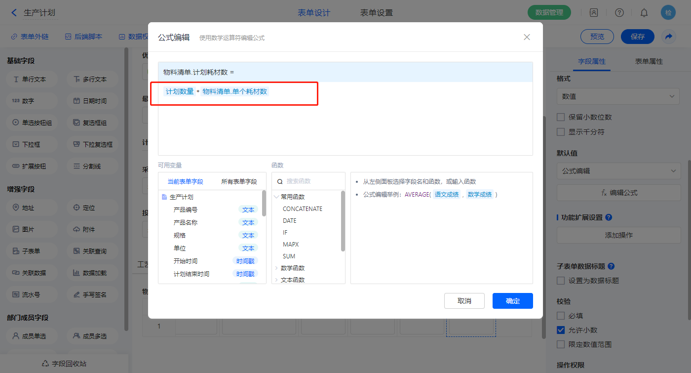 5)【物料清单.计划耗材数】字段,设置默认值为公式编辑,如图设置公式;