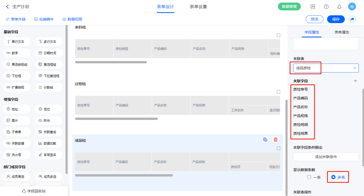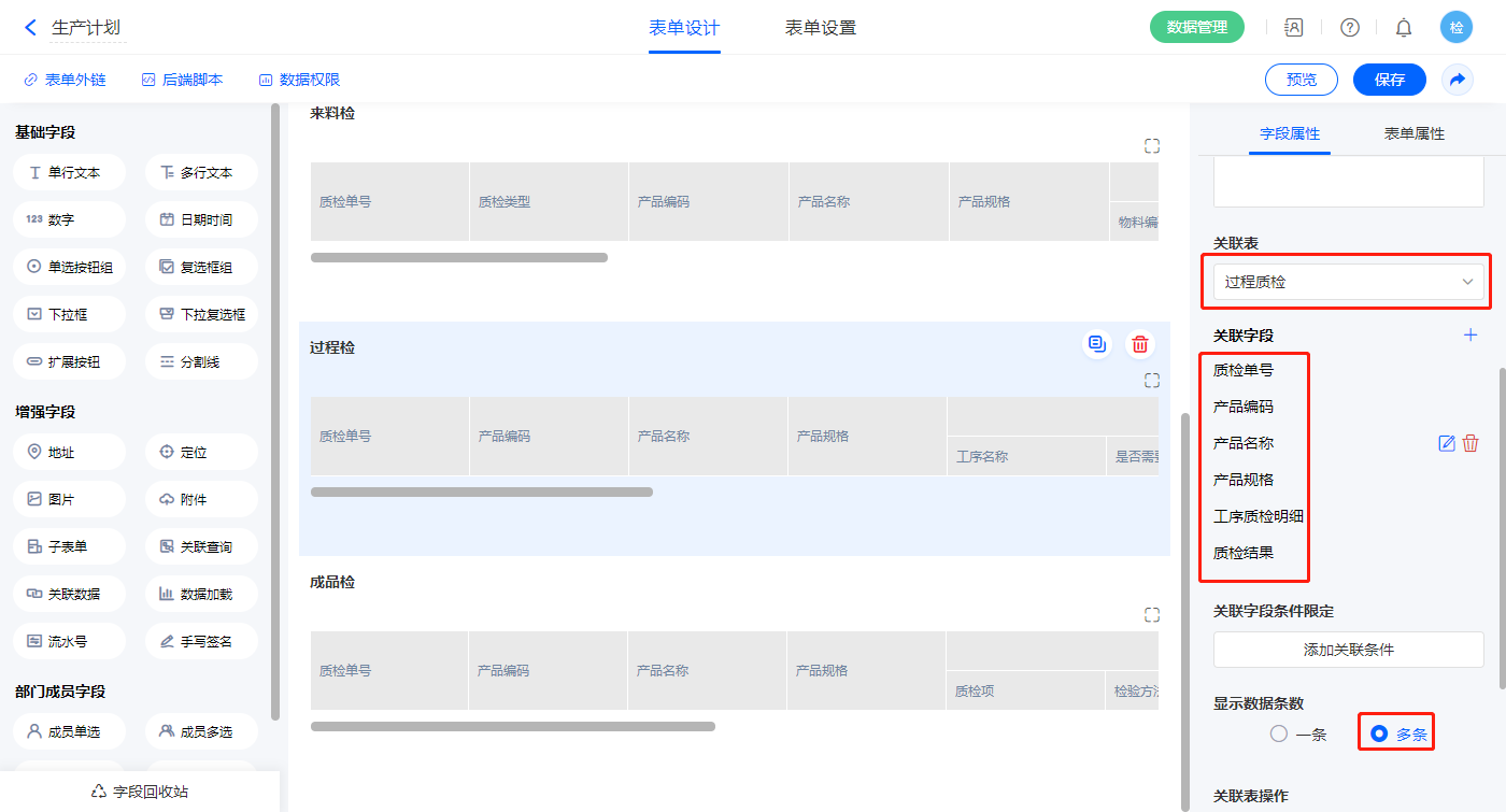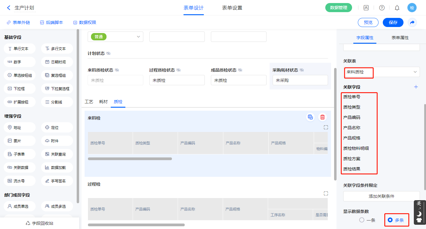 【来料检】关联查询字段,设置关联表为【加工单】并如图选择关联字段,设置显示数据条数为多条;