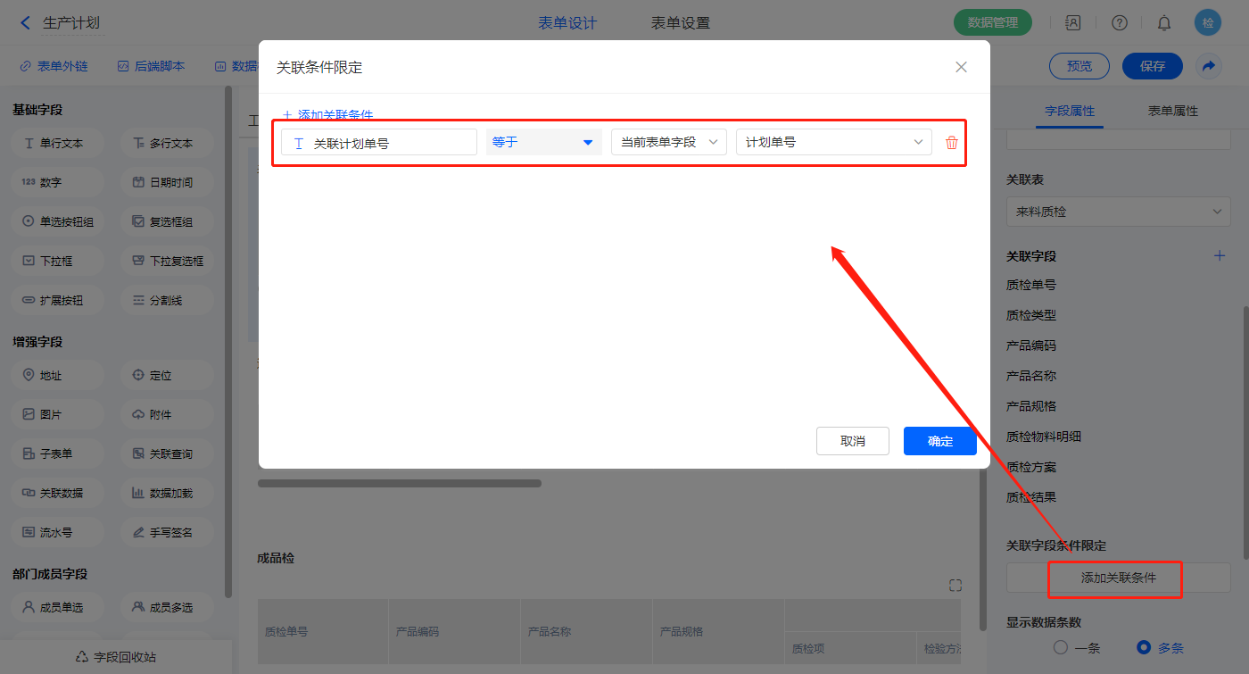 以上关联查询字段添加关联条件,根据【计划单号】字段相关联;