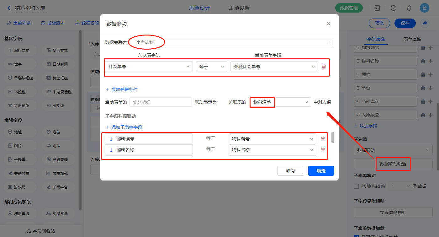 2)【物料明细】子表单字段,设置默认值为数据联动,设置联动条件及联动字段;