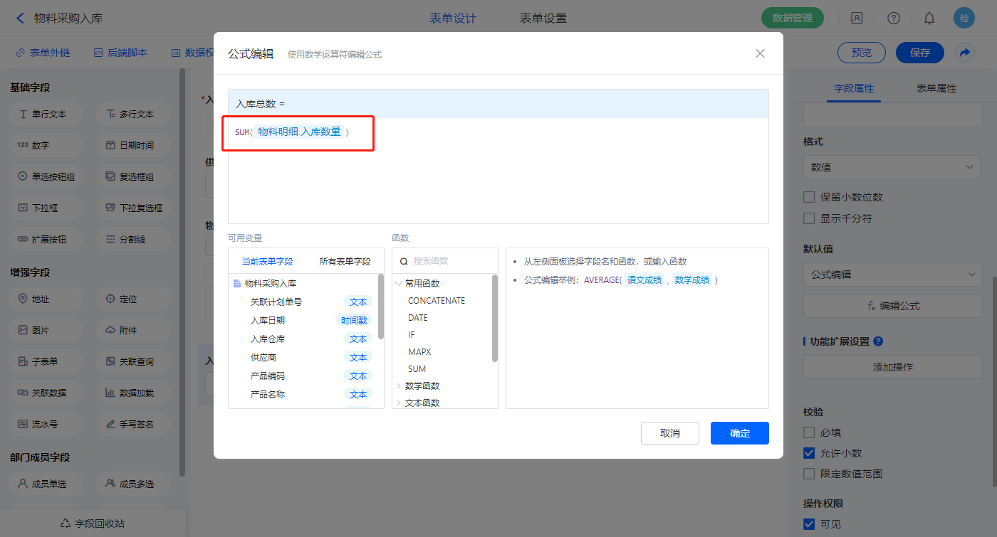 4)【入库总数】字段,设置默认值为公式编辑,如图设置公式;