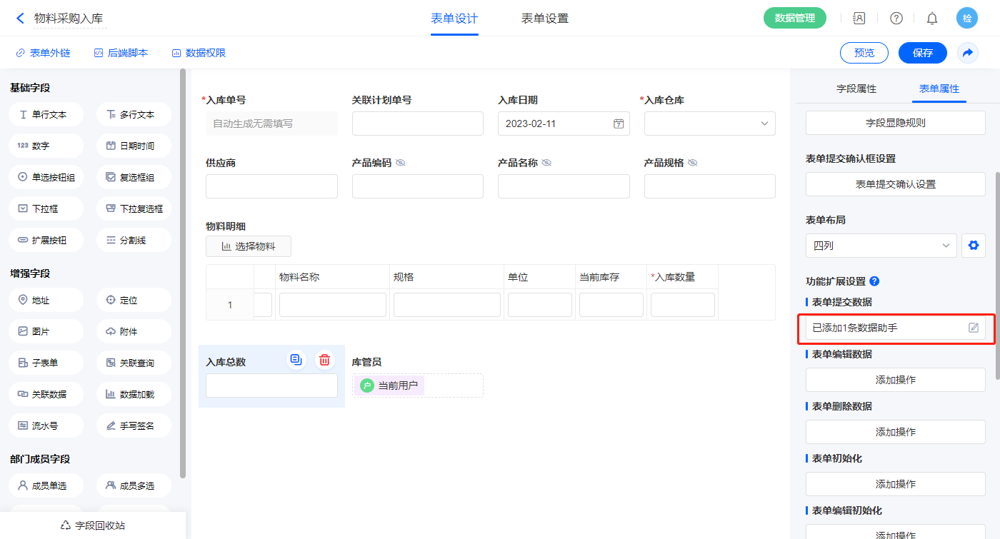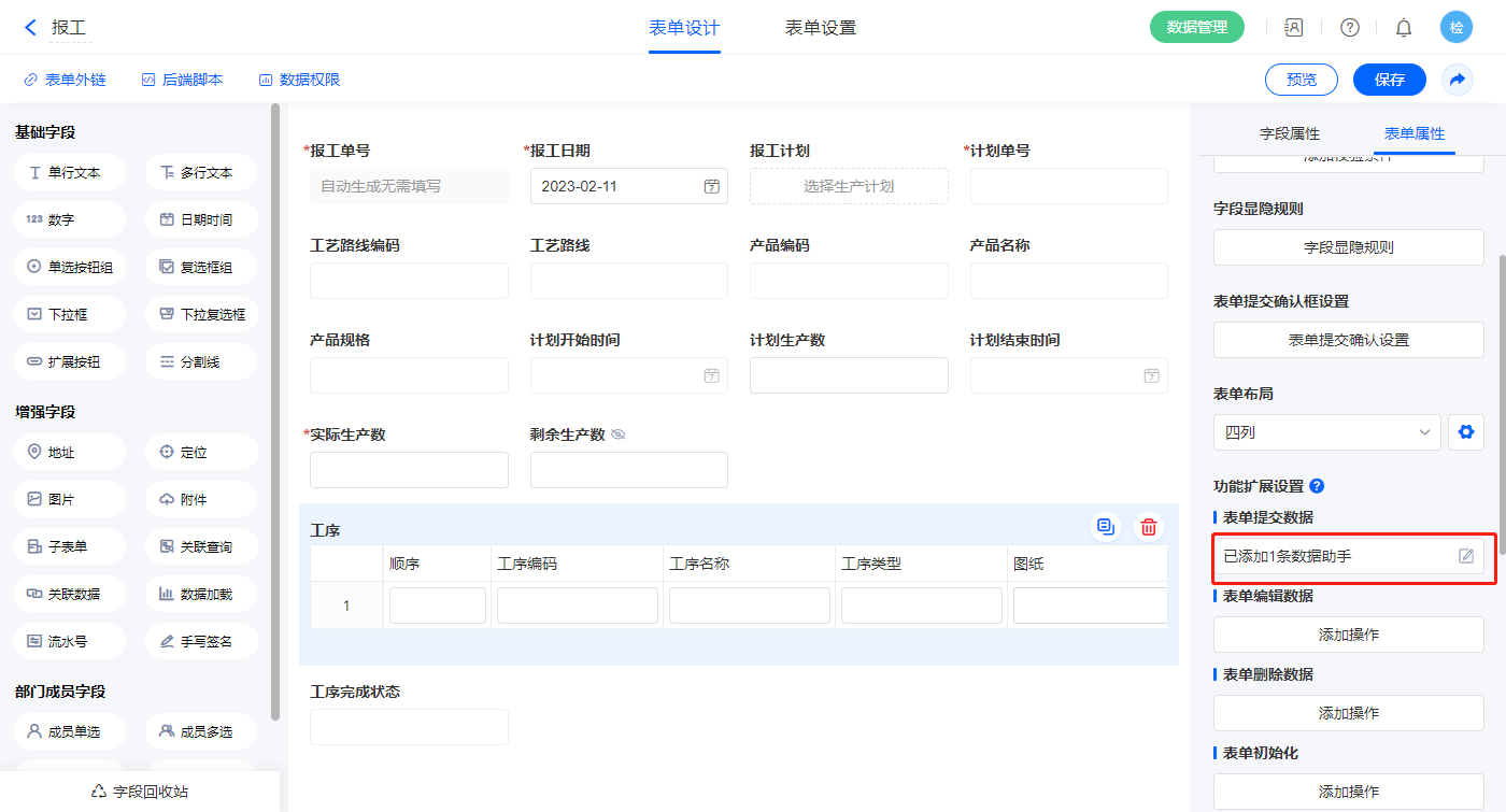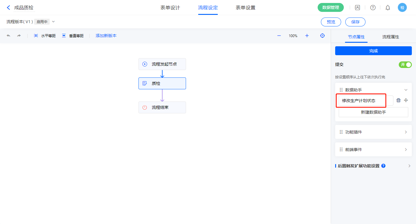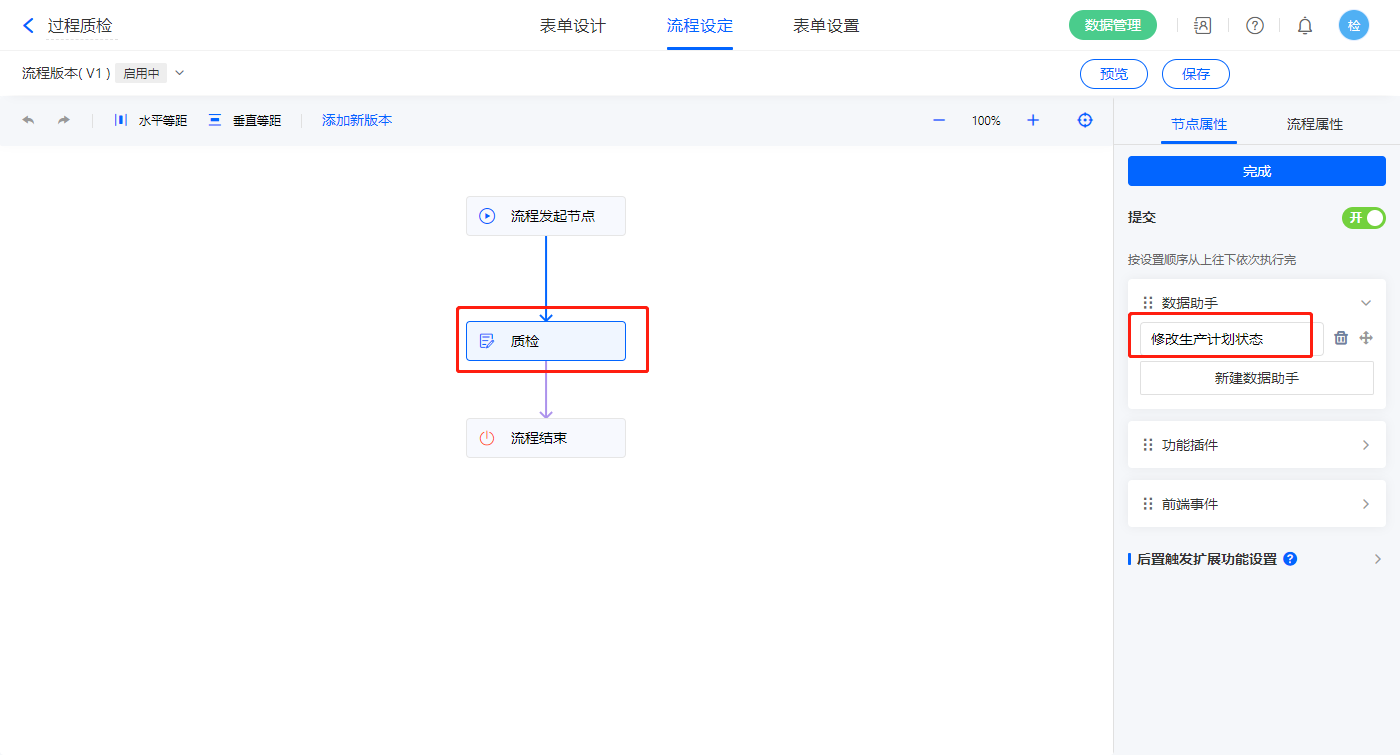 4)该表单是流程表单,设置流程节点质检,该节点属性的节点权限提交设置1条数据助手,名称修改生产计划状态;