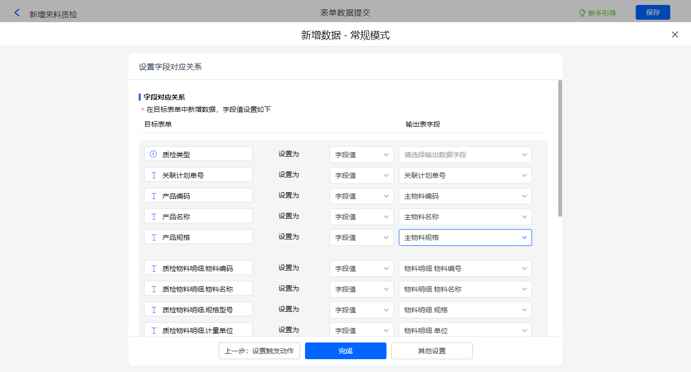 新增新增数据的执行动作,选择目标表单【来料质检】,选择对应字段;