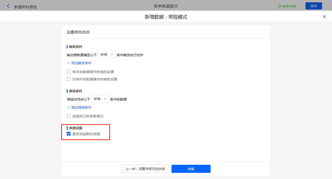其他设置勾选发起新流程,设置好点击【完成】并保存该数据助手;