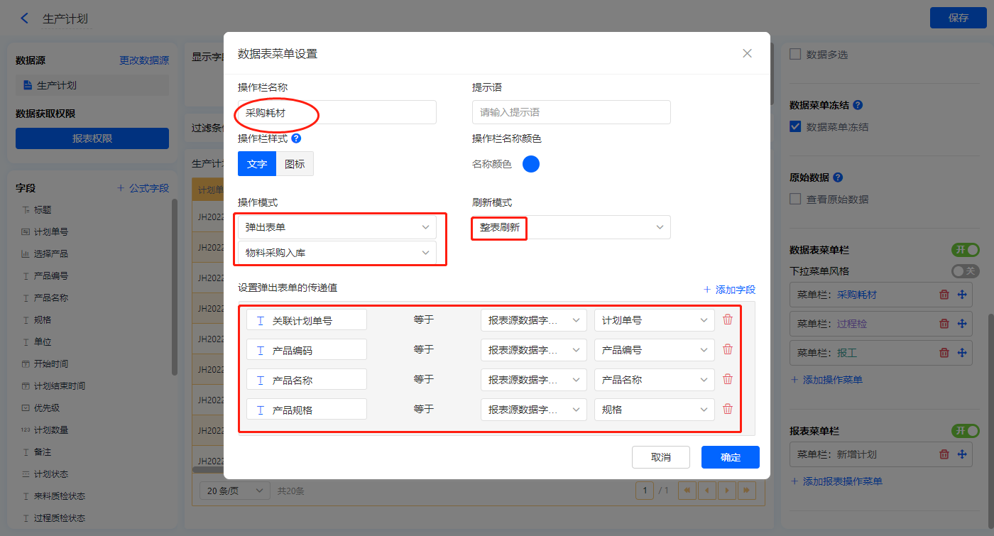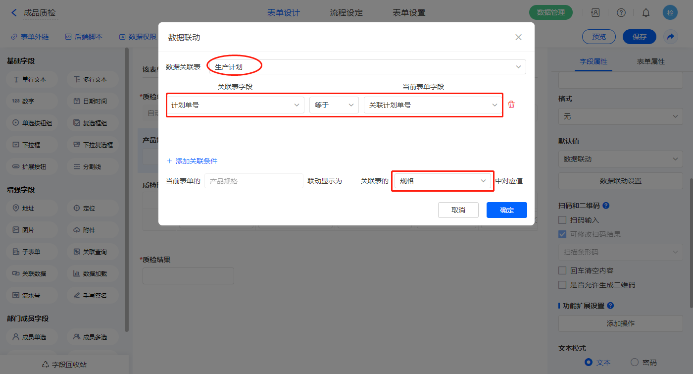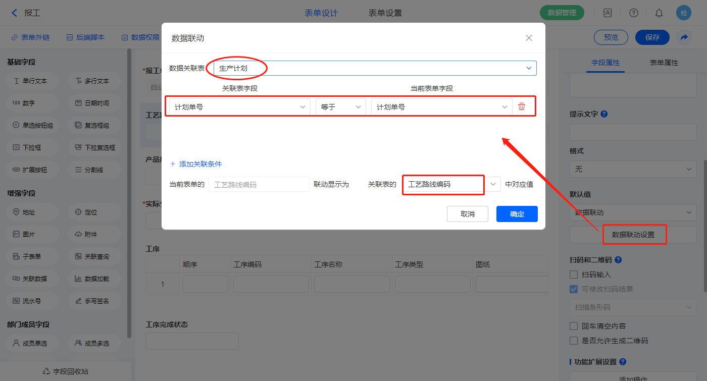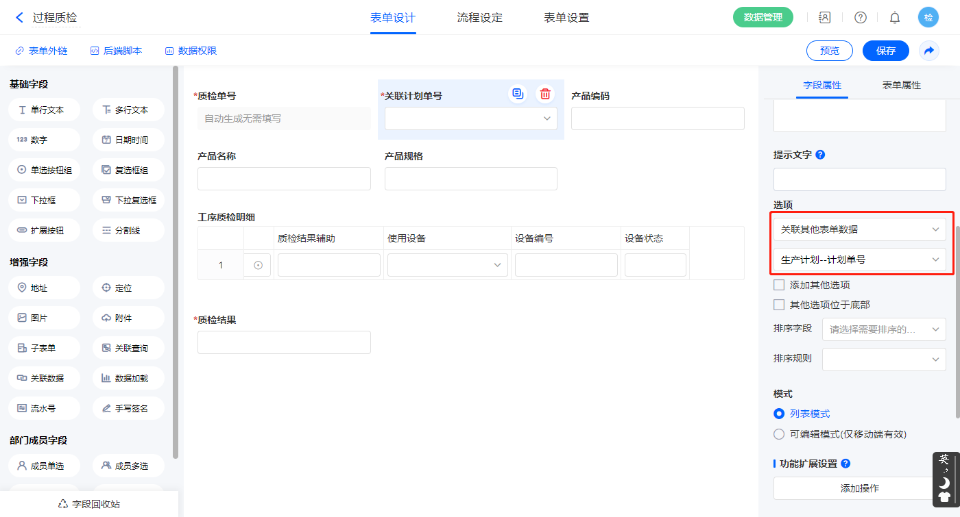 1)【关联计划单号】字段,选择设置为关联其他表单数据,关联生产计划的【计划单号】字段;