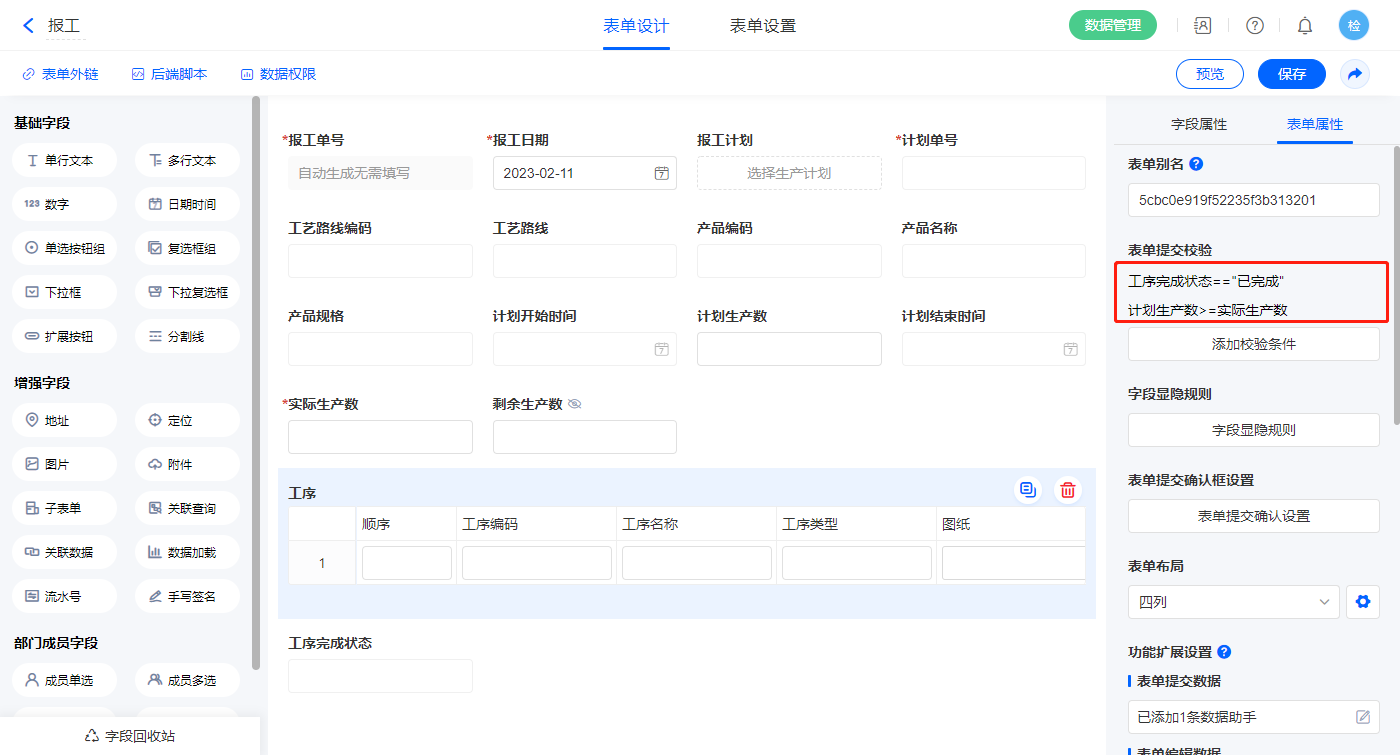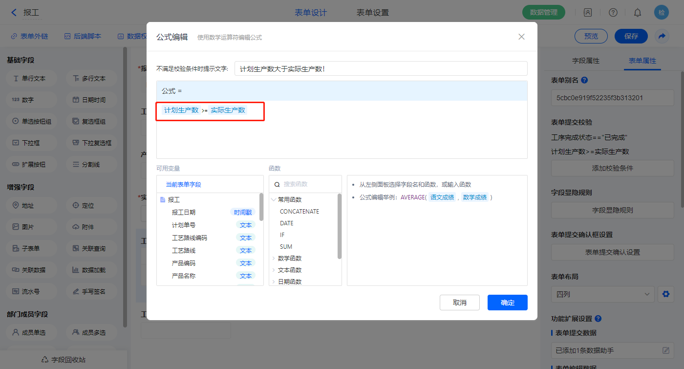 当公式“计划生产数>=实际生产数”不满足提交时报“计划生产数大于实际生产数!”提示;