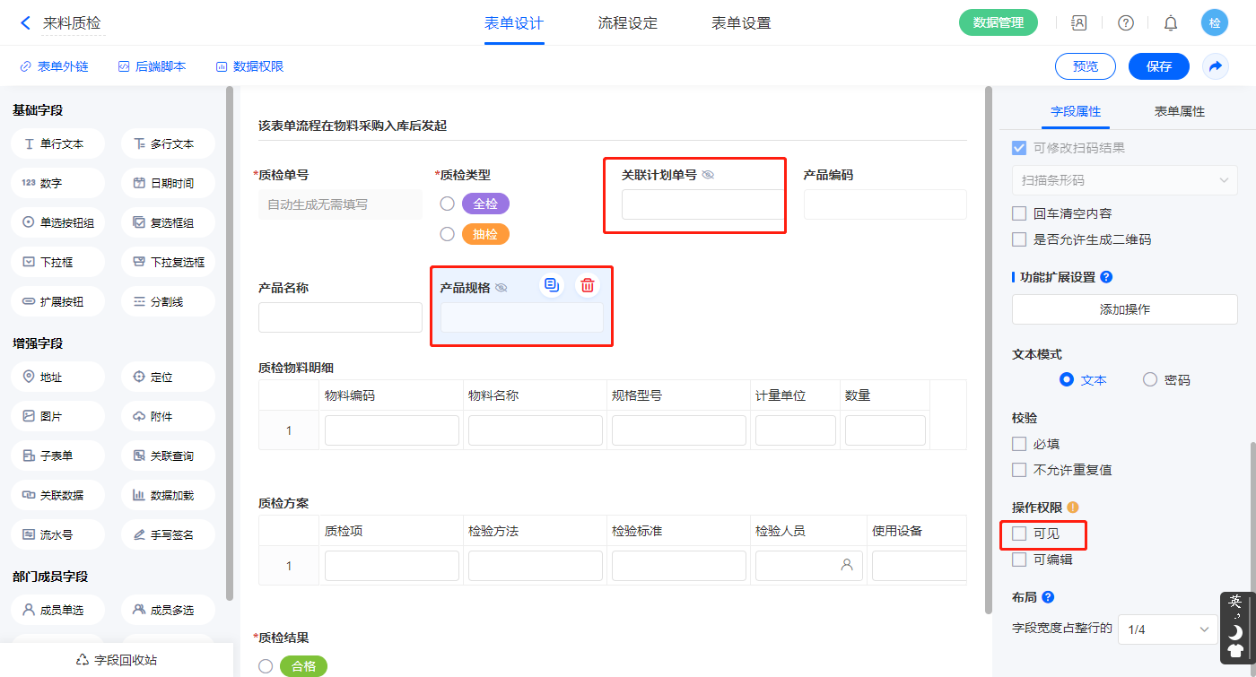1)【关联计划单号】、【产品规格】设置操作权限为不可见;