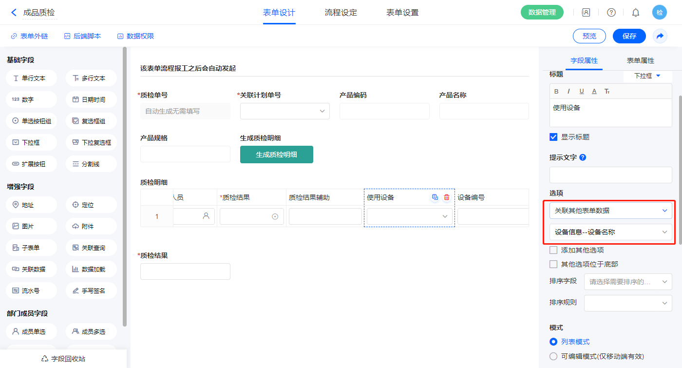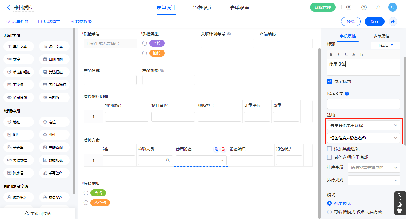 6)【质检明细.使用设备】字段,选择设置为关联其他表单数据,关联设备信息的【设备名称】字段;