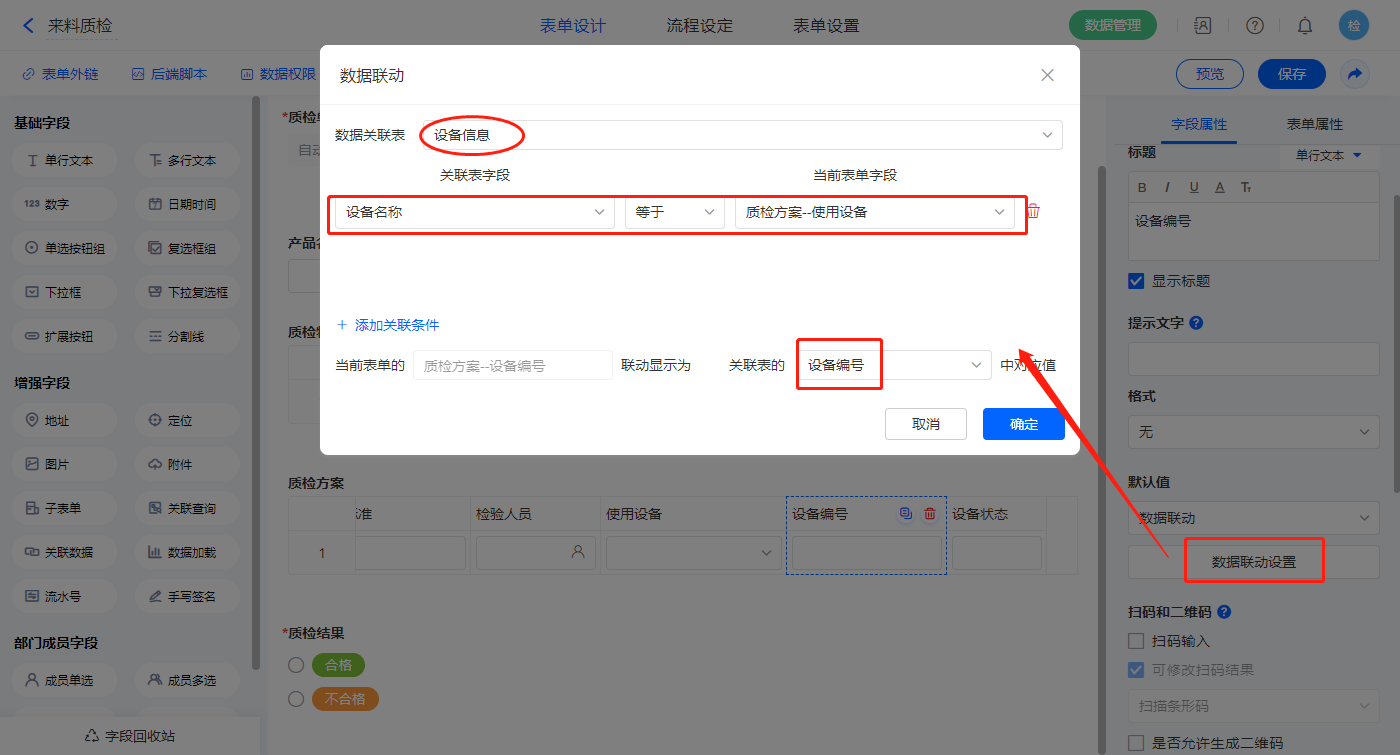 【质检方案.设备编号】、【质检方案.设备状态】字段,设置默认值为数据联动,以上字段关联表及关联条件相同,设置对应的联动字段即可;