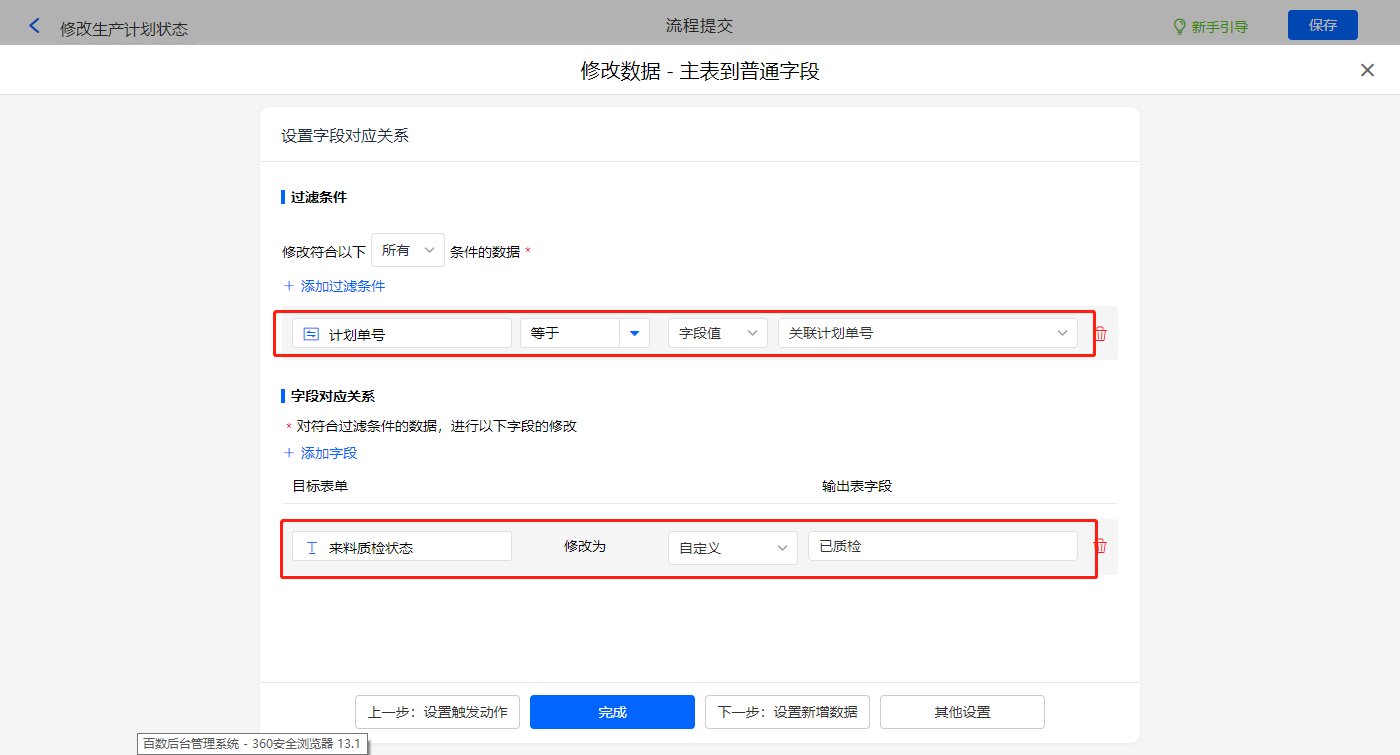 新增修改数据的执行动作,选择修改【生产计划】表单,选择对应过滤条件,以及需要修改的字段,设置好点击【完成】并保存该数据助手;