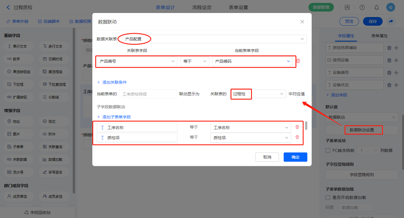1)【工序质检明细】子表单字段,设置默认值为数据联动,设置联动条件及联动字段;