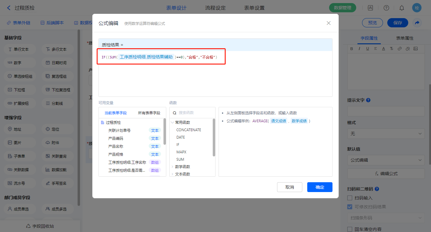 【质检结果】字段,设置默认值为公式编辑,设置公式:“IF((SUM(工序质检明细.质检结果辅助)==0),"合格","不合格")”;