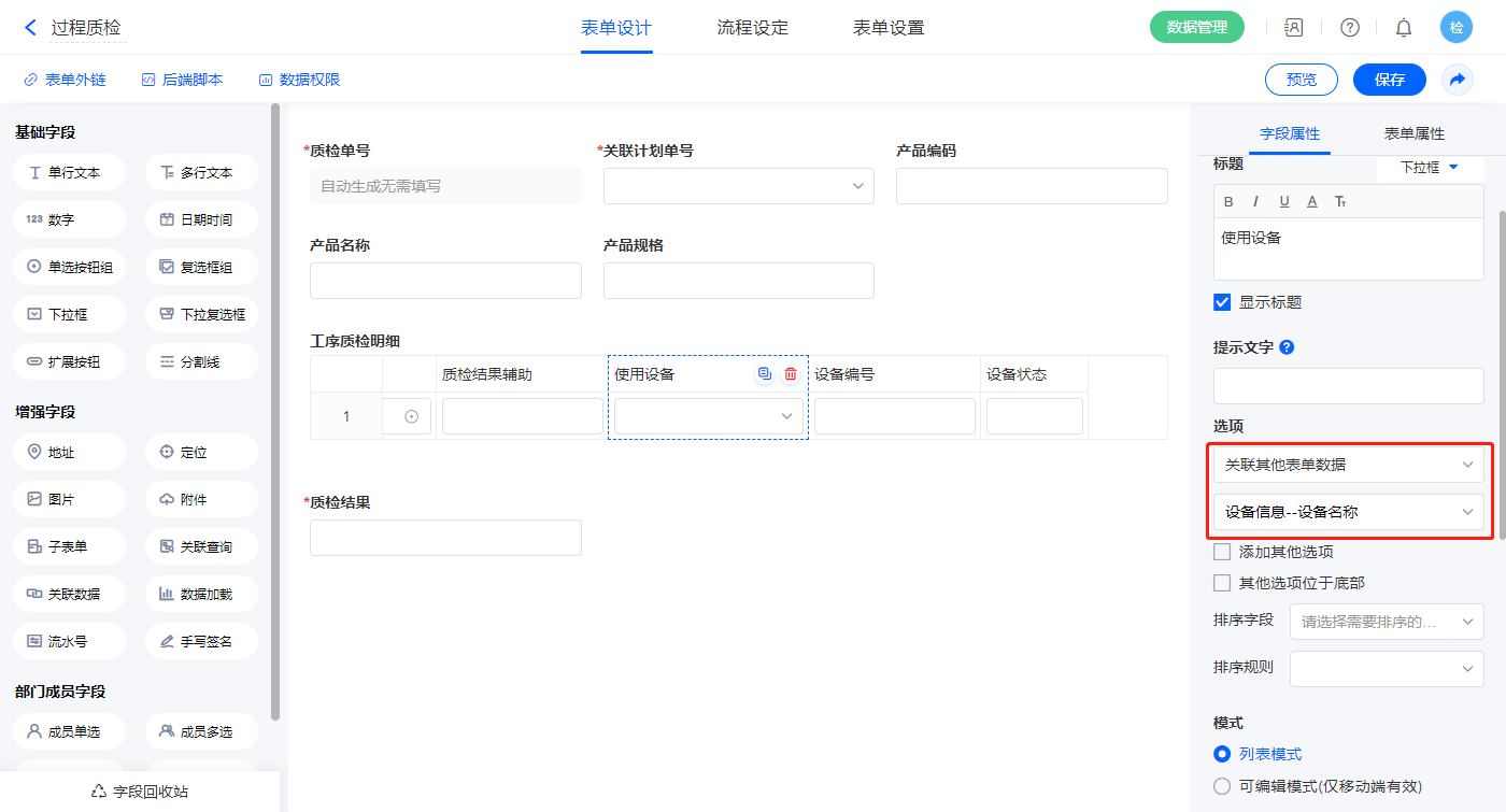 3)【工序质检明细.使用设备】字段,选择设置为关联其他表单数据,关联设备信息的【设备名称】字段;