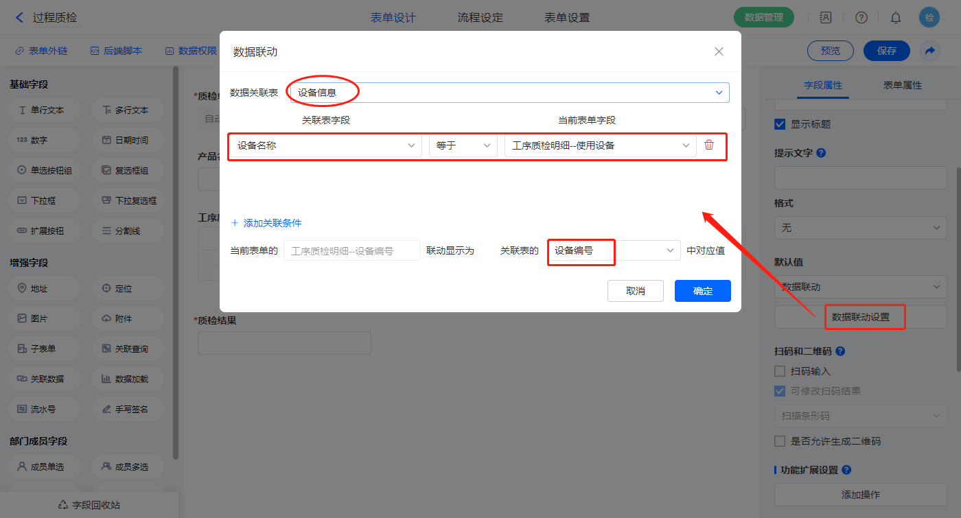 【工序质检明细设备编号】、【工序质检明细.设备状态】字段,设置默认值为数据联动,以上字段关联表及关联条件相同,设置对应的联动字段即可;